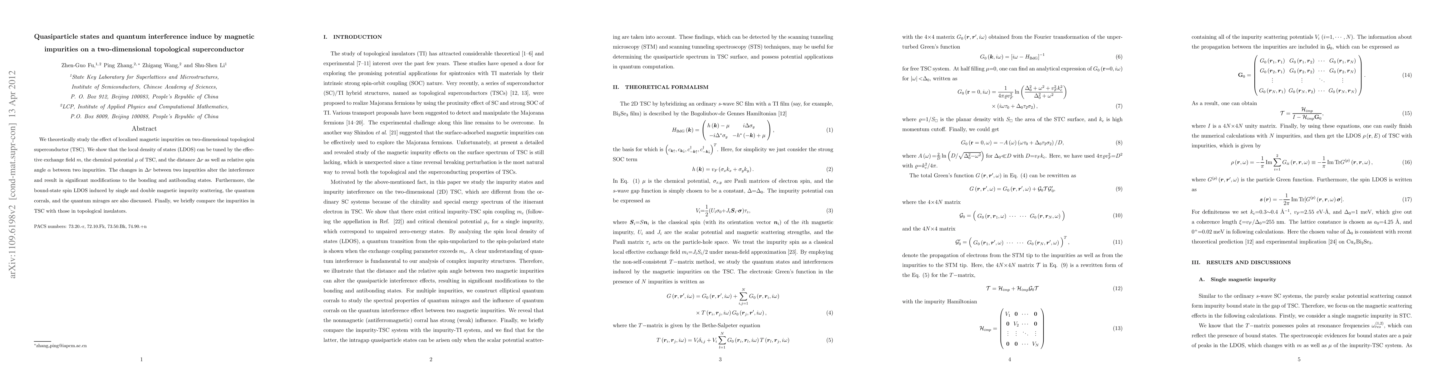This paper investigates how localized magnetic impurities affect quasiparticle states in a two-dimensional topological superconductor. The study reveals that the local density of states can be modulated by factors such as the effective exchange field, chemical potential, impurity distance, and relative spin angle, leading to significant changes in bonding and antibonding states due to quantum interference.