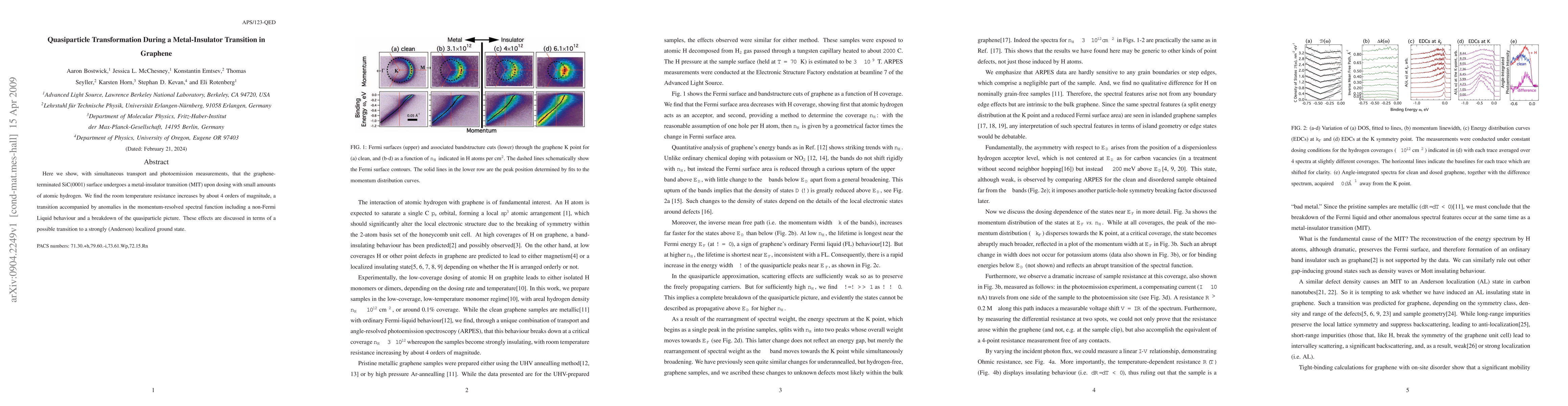 Here we show, with simultaneous transport and photoemission measurements, that the graphene terminated SiC(0001) surface undergoes a metal-insulator transition (MIT) upon dosingwith small amounts of atomic hydrogen. We find the room temperature resistance increases by about 4 orders of magnitude, a transition accompanied by anomalies in the momentum-resolved spectral function including a non-Fermi Liquid behaviour and a breakdown of the quasiparticle picture. These effects are discussed in terms of a possible transition to a strongly (Anderson) localized ground state.