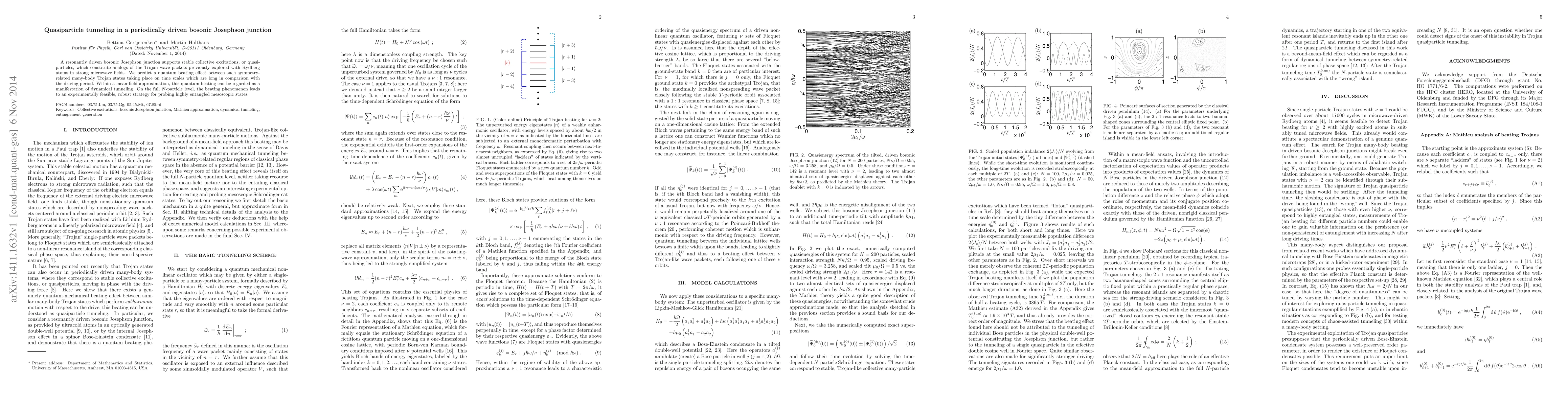 This paper explores quasiparticle tunneling in a periodically driven bosonic Josephson junction, predicting a quantum beating effect between many-body Trojan states that manifests as dynamical tunneling. This quantum beating offers a robust method for probing highly entangled mesoscopic states experimentally.