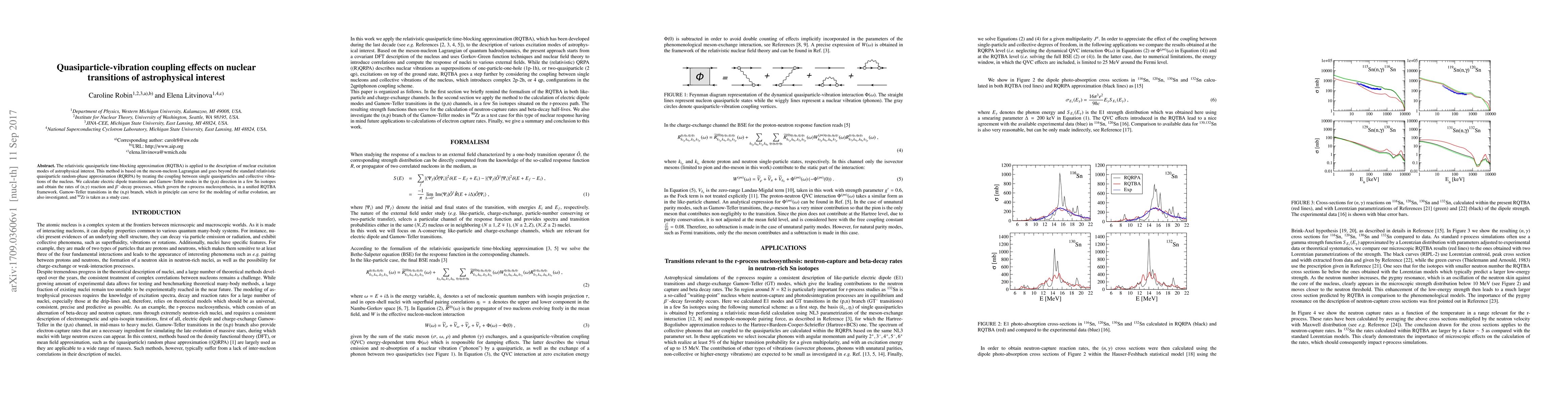 This paper applies the relativistic quasiparticle time-blocking approximation (RQTBA) to study nuclear excitation modes and transitions in Sn isotopes, focusing on electric dipole and Gamow-Teller modes. It calculates rates for (n,$\gamma$) reactions and $\beta^-$-decay processes relevant to r-process nucleosynthesis and examines Gamow-Teller transitions in $^{90}$Zr for stellar evolution modeling.