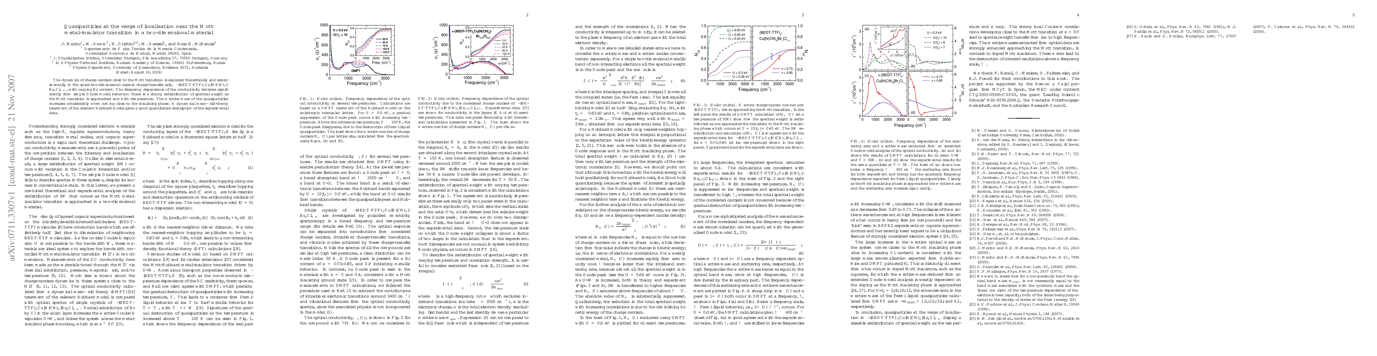 This paper investigates the quasiparticle behavior near the Mott metal-insulator transition in a quasi-two-dimensional organic charge-transfer salt, finding significant spectral weight redistribution and increased quasiparticle effective mass. Theoretical modeling aligns well with experimental data, revealing complex dynamics of charge carriers.