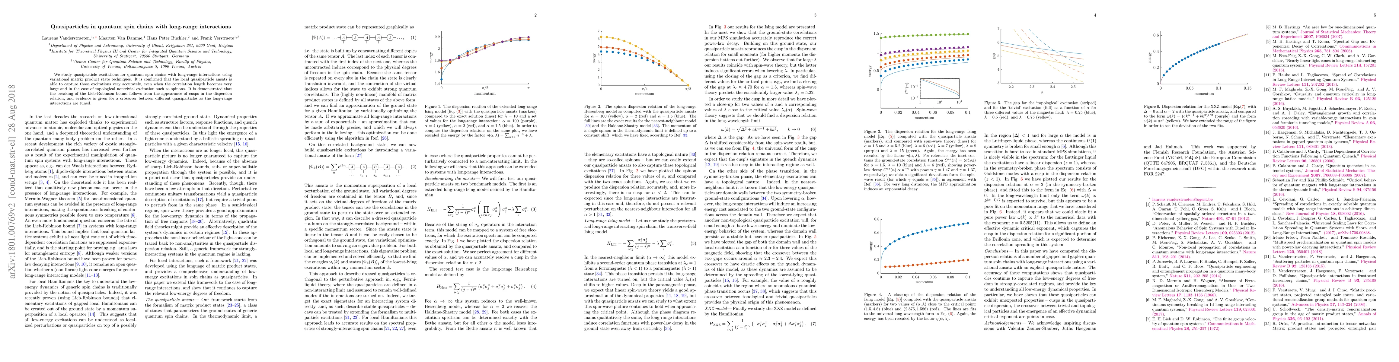 This paper investigates quasiparticle excitations in quantum spin chains with long-range interactions using variational matrix product state techniques, confirming the local quasiparticle ansatz's accuracy, even for topologically nontrivial excitations like spinons. It shows that the breaking of the Lieb-Robinson bound correlates with cusps in the dispersion relation and suggests a crossover between different quasiparticles under tuned long-range interactions.