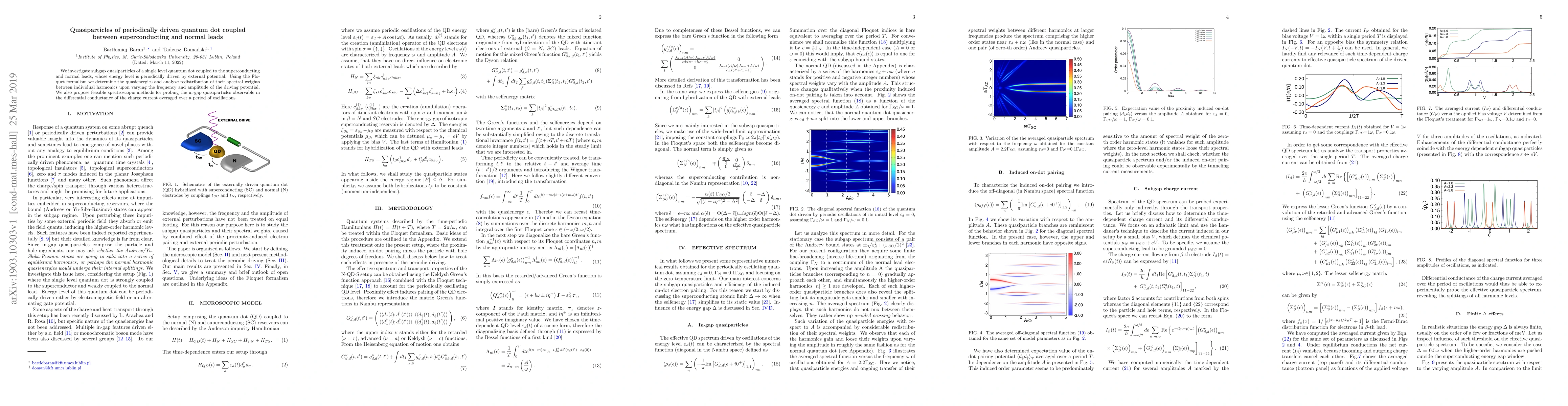 The paper presents a detailed analysis of the effective quasiparticle spectrum of a periodically driven quantum dot coupled to superconducting and normal leads, utilizing Floquet formalism to understand the redistribution of spectral weights between harmonics.