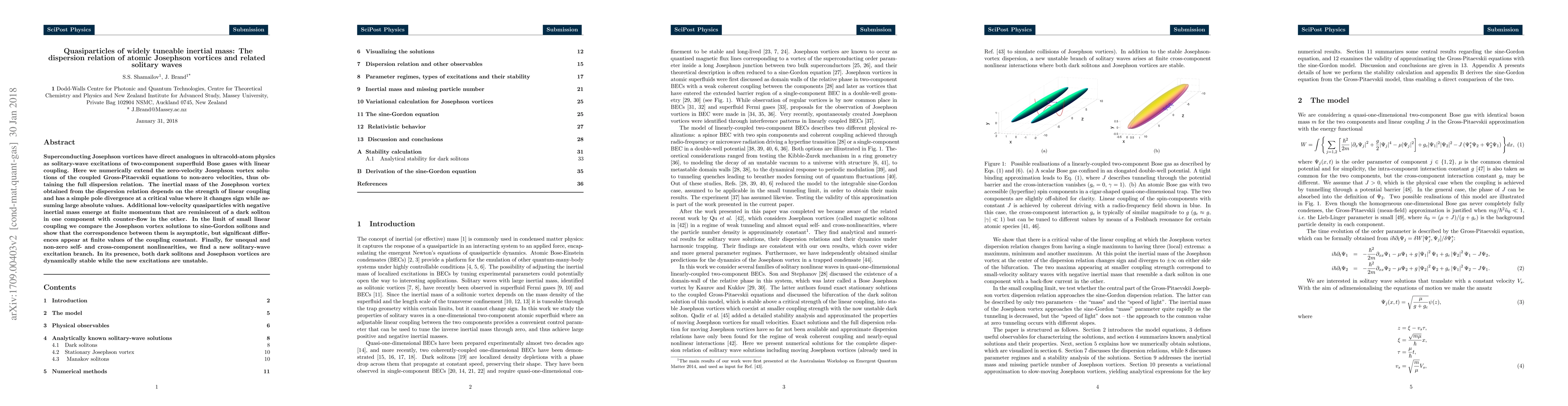 This paper explores the dispersion relation of atomic Josephson vortices in ultracold-atom physics, revealing a tunable inertial mass dependent on linear coupling strength. It identifies new solitary-wave excitations, including quasiparticles with negative inertial mass, and discusses their stability and comparison to sine-Gordon solitons.