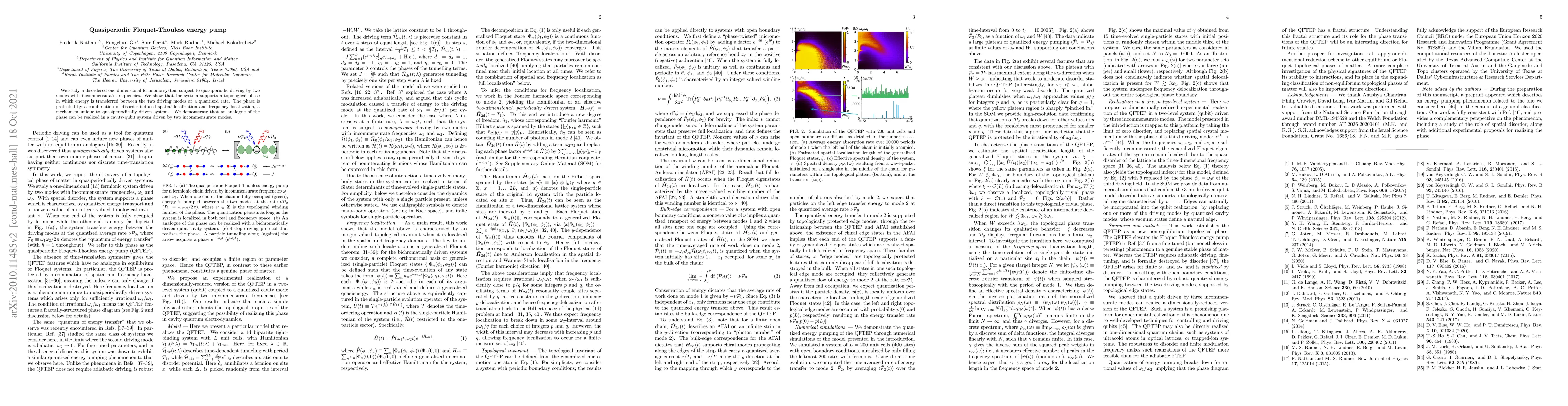 Recent work [M. H. Kolodrubetz et al, PRL 120, 150601] has demonstrated that periodically driven one-dimensional fermionic systems can support quantized energy pumping resulting from an adiabatic modulation of a second parameter. In this work, we explore this topological Floquet-Thouless energy pump in the quasiperiodic driving regime where the parametric driving occurs at finite frequency. We show that quantization of energy pumping persists for finite ramping frequencies, as long as they are incommensurate with the driving frequency, and the system remains localized by spatial disorder. Thus, the topological Floquet-Thouless energy pump is stable beyond the adiabatic regime, occupying a finite region of parameter space. Phase transitions away from these topological phases are accompanied by delocalization in position space, photon number (energy) space, or both. Using a dimensional reduction scheme, we demonstrate that a related phase can be realized with a cavity-qubit system driven by two incommensurate modes.