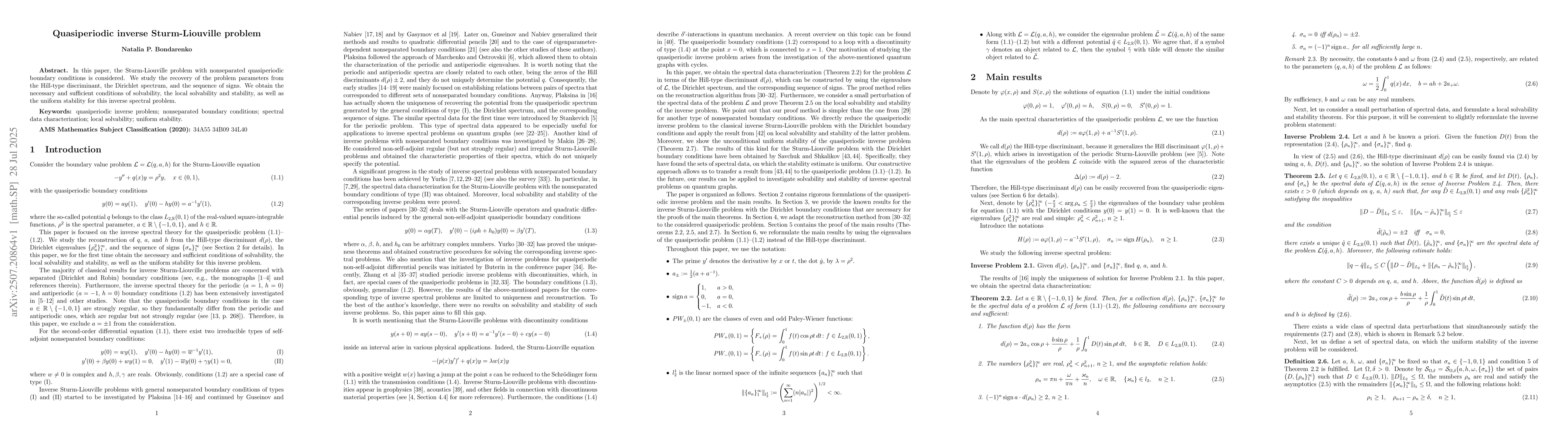 In this paper, the Sturm-Liouville problem with nonseparated quasiperiodic boundary conditions is considered. We study the recovery of the problem parameters from the Hill-type discriminant, the Dirichlet spectrum, and the sequence of signs. We obtain the necessary and sufficient conditions of solvability, the local solvability and stability, as well as the uniform stability for this inverse spectral problem.