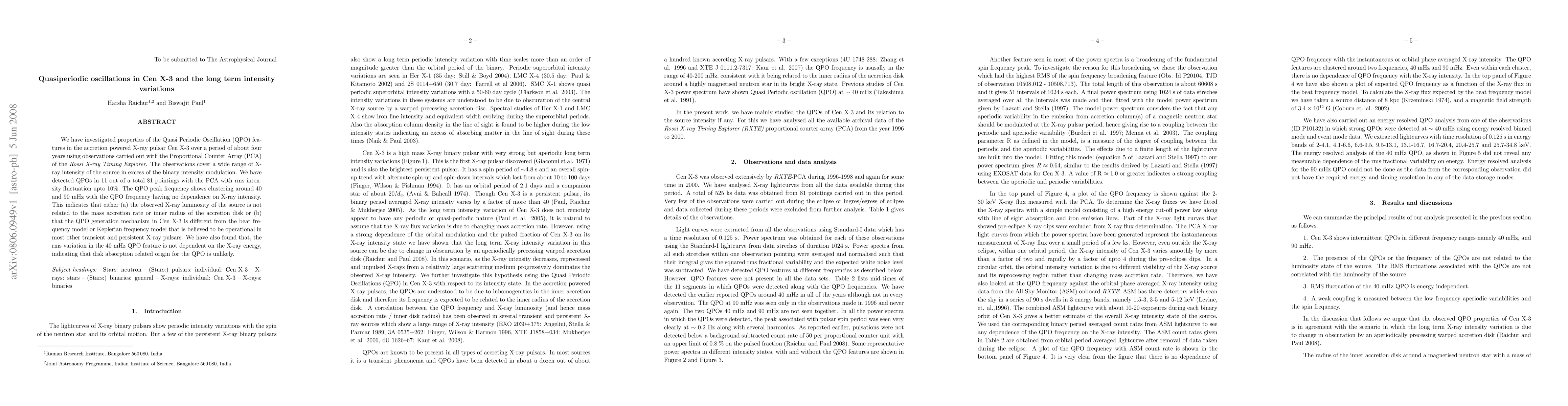 Researchers studied Quasi Periodic Oscillations in Cen X-3 over 4 years, detecting QPOs in 11 out of 81 observations with varying intensity fluctuations.