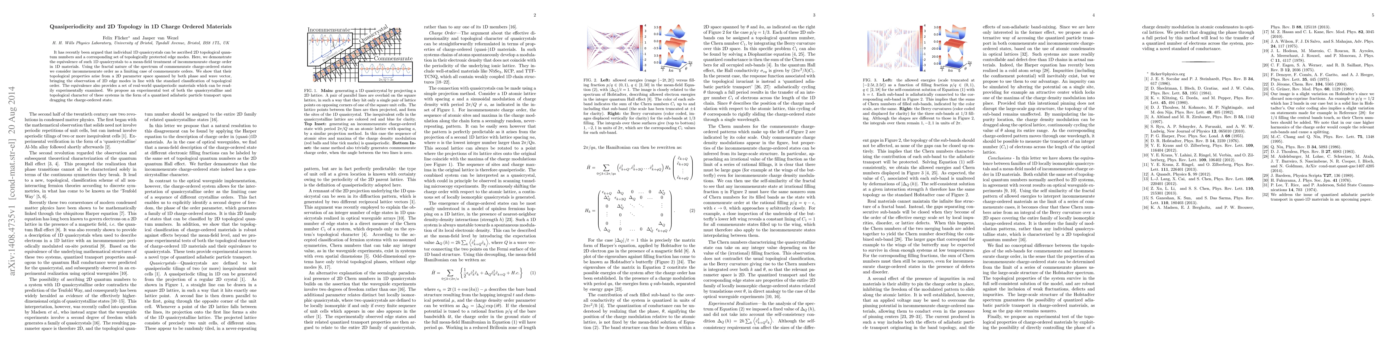 This research establishes a link between 1D quasicrystals and 2D topological quantum numbers, demonstrating that 1D quasicrystals can exhibit topologically protected edge modes. The study proposes a mean-field treatment of incommensurate charge order in 1D materials, suggesting a 2D parameter space for their topological properties, and proposes an experimental test via quantized adiabatic particle transport.