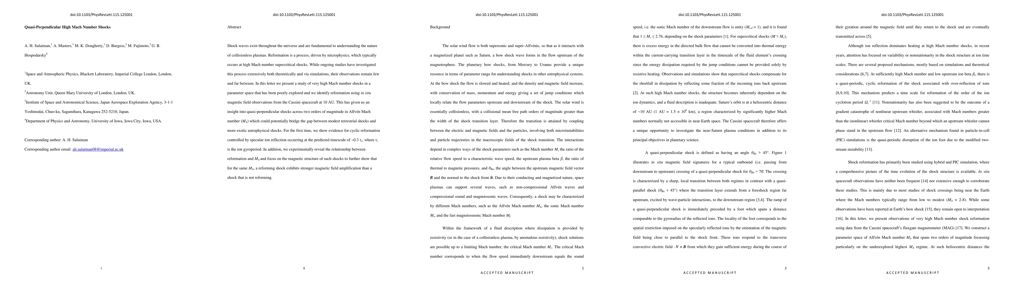 Shock waves exist throughout the universe and are fundamental to understanding the nature of collisionless plasmas. Reformation is a process, driven by microphysics, which typically occurs at high Mach number supercritical shocks. While ongoing studies have investigated this process extensively both theoretically and via simulations, their observations remain few and far between. In this letter we present a study of very high Mach number shocks in a parameter space that has been poorly explored and we identify reformation using in situ magnetic field observations from the Cassini spacecraft at 10 AU. This has given us an insight into quasi-perpendicular shocks across two orders of magnitude in Alfven Mach number (MA) which could potentially bridge the gap between modest terrestrial shocks and more exotic astrophysical shocks. For the first time, we show evidence for cyclic reformation controlled by specular ion reflection occurring at the predicted timescale of ~0.3 {\tau}c, where {\tau}c is the ion gyroperiod. In addition, we experimentally reveal the relationship between reformation and MA and focus on the magnetic structure of such shocks to further show that for the same MA, a reforming shock exhibits stronger magnetic field amplification than a shock that is not reforming.