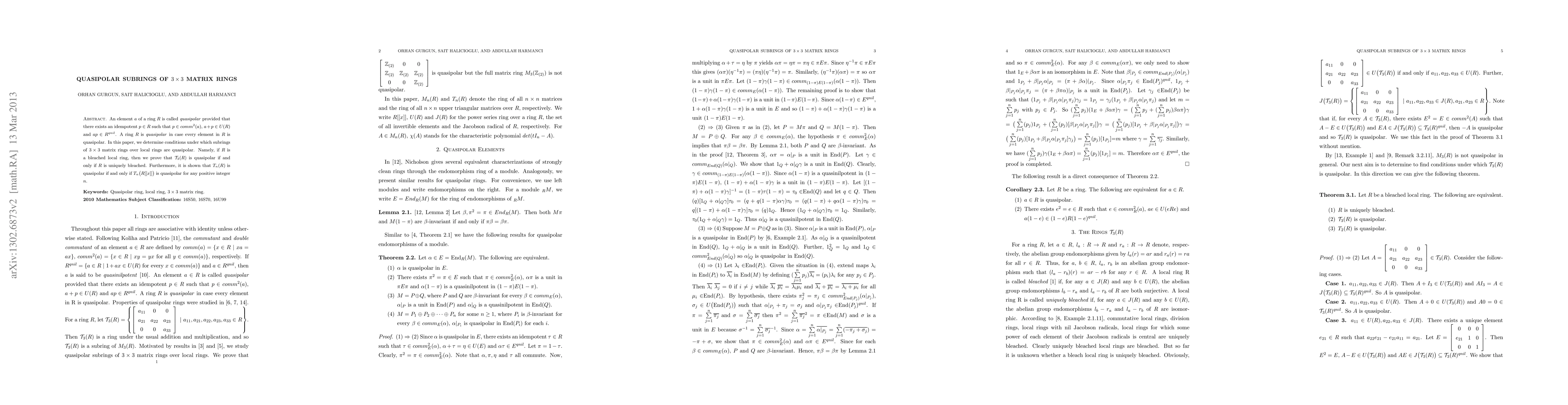 This paper investigates quasipolar subrings within $3\times 3$ matrix rings over local rings, proving that $\mathcal{T}_3(R)$ is quasipolar if and only if $R$ is uniquely bleached. It also shows that $T_n(R)$ is quasipolar if and only if $T_n\big(R[[x]]\big)$ is quasipolar for any positive integer $n$.