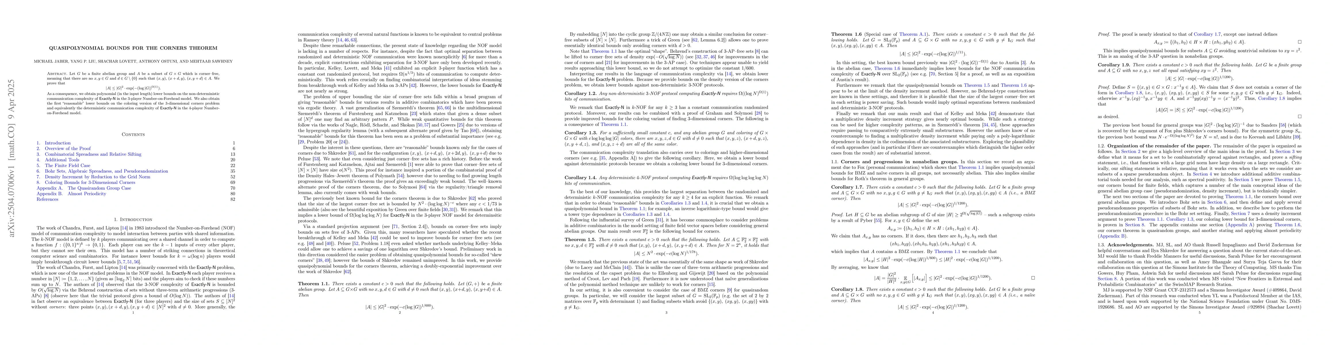 The paper proves a quasipolynomial bound on corner-free subsets of finite abelian groups, leading to polynomial lower bounds on communication complexity for certain problems.