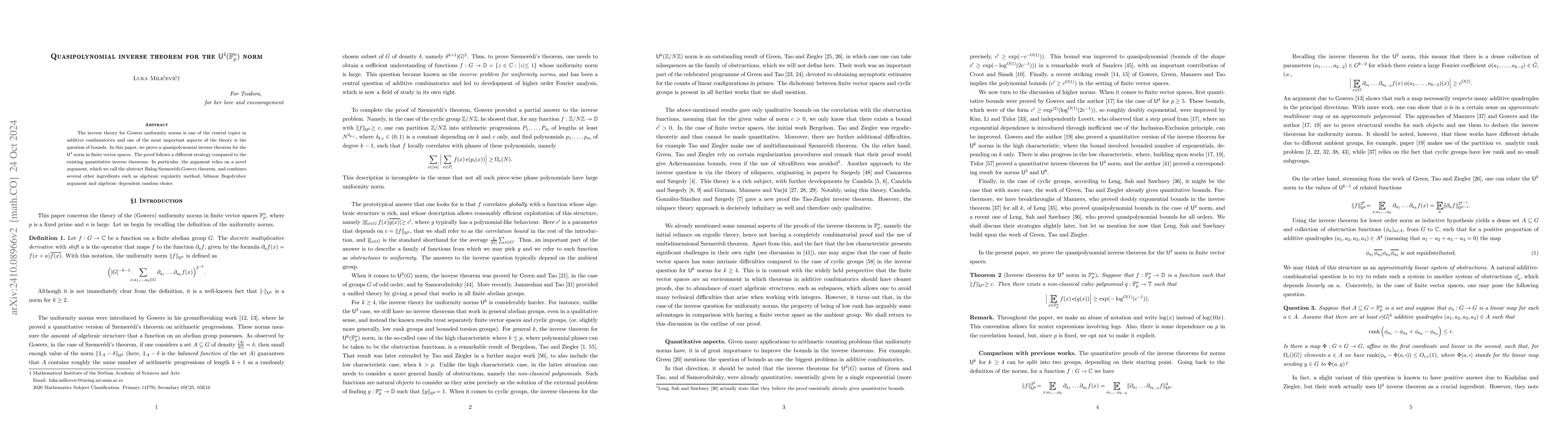 This paper establishes a quasipolynomial inverse theorem for the $\mathsf{U}^4$ Gowers uniformity norm in finite vector spaces, using a novel "abstract Balog-Szemerédi-Gowers theorem" alongside algebraic regularity, bilinear Bogolyubov arguments, and algebraic dependent random choice. The approach diverges from existing quantitative inverse theorems.