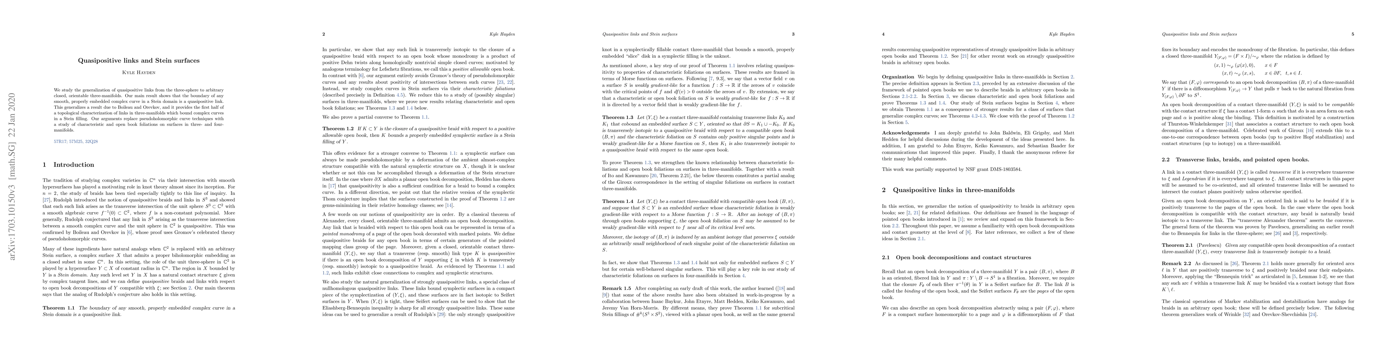 We study the generalization of quasipositive links from the three-sphere to arbitrary closed, orientable three-manifolds. Our main result shows that the boundary of any smooth, properly embedded complex curve in a Stein domain is a quasipositive link. This generalizes a result due to Boileau and Orevkov, and it provides the first half of a topological characterization of links in three-manifolds which bound complex curves in a Stein filling. Our arguments replace pseudoholomorphic curve techniques with a study of characteristic and open book foliations on surfaces in three- and four-manifolds.