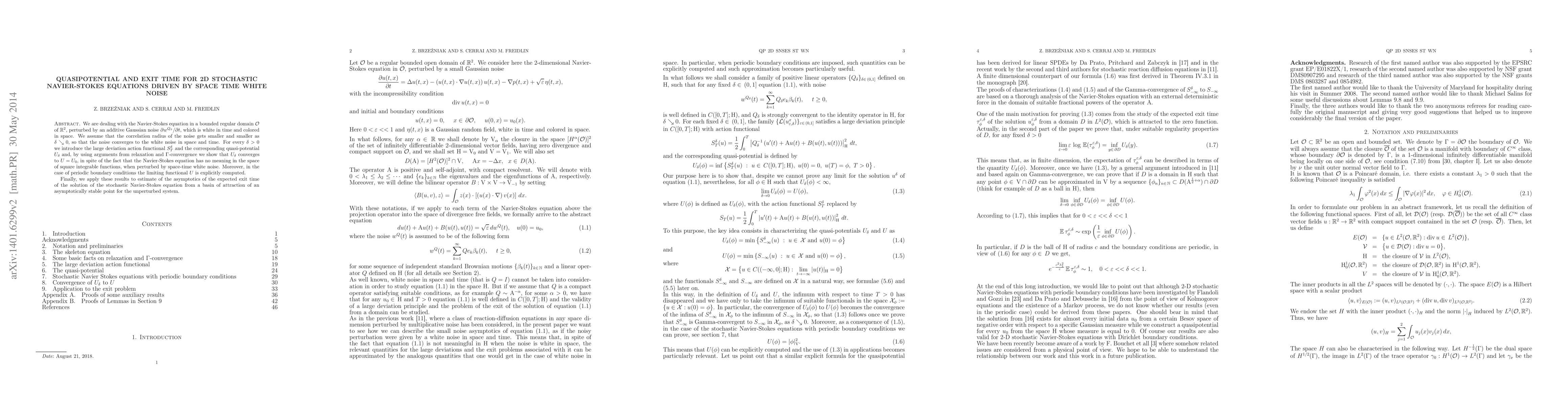 We are dealing with the Navier-Stokes equation in a bounded regular domain $D$ of $\mathbb{R}^2$, perturbed by an additive Gaussian noise $\partial w^{Q_\delta}/\partial t$, which is white in time and colored in space. We assume that the correlation radius of the noise gets smaller and smaller as $\delta\searrow 0$, so that the noise converges to the white noise in space and time. For every $\delta>0$ we introduce the large deviation action functional $S^\delta_{0,T}$ and the corresponding quasi-potential $U_\delta$ and, by using arguments from relaxation and $\Gamma$-convergence we show that $U_\delta$ converges to $U=U_0$, in spite of the fact that the Navier-Stokes equation has no meaning in the space of square integrable functions, when perturbed by space-time white noise. Moreover, in the case of periodic boundary conditions the limiting functional $U$ is explicitly computed. Finally, we apply these results to estimate of the asymptotics of the expected exit time of the solution of the stochastic Navier-Stokes equation from a basin of attraction of an asymptotically stable point for the unperturbed system.