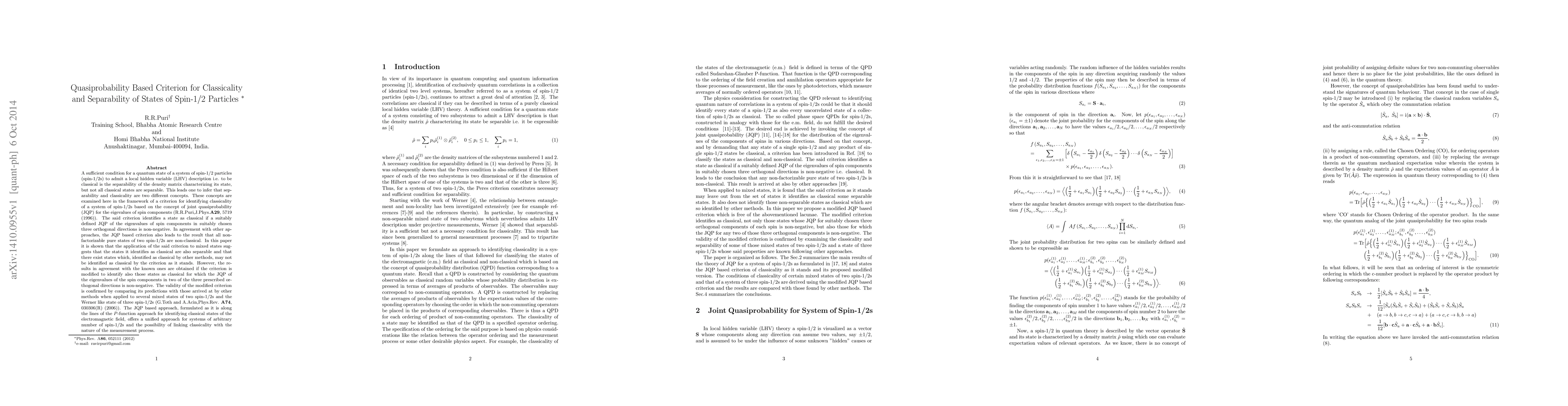 This paper proposes a quasiprobability-based criterion for identifying classicality in spin-1/2 particle states, distinguishing it from separability. The criterion uses joint quasiprobability for spin components' eigenvalues to determine if a state is classical, confirming its validity through comparisons with other methods.