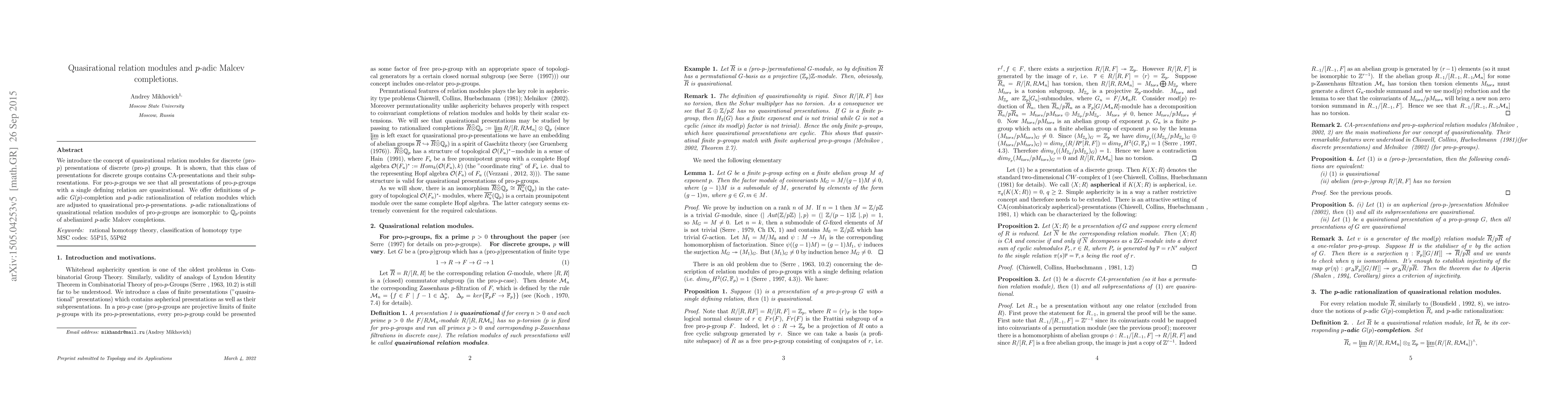 We introduce the concept of quasirational relation modules for discrete (pro- p) presentations of discrete (pro-p) groups. It is shown, that this class of presentations for discrete groups contains CA-presentations and their subpresentations. For pro-p-groups we see that all presentations of pro-p-groups with a single defining relation are quasirational. We offer definitions of p- adic G(p)-completion and p-adic rationalization of relation modules which are adjusted to quasirational pro-p-presentations. p-adic rationalizations of quasirational relation modules of pro-p-groups are isomorphic to abelianized p-adic Malcev completions.