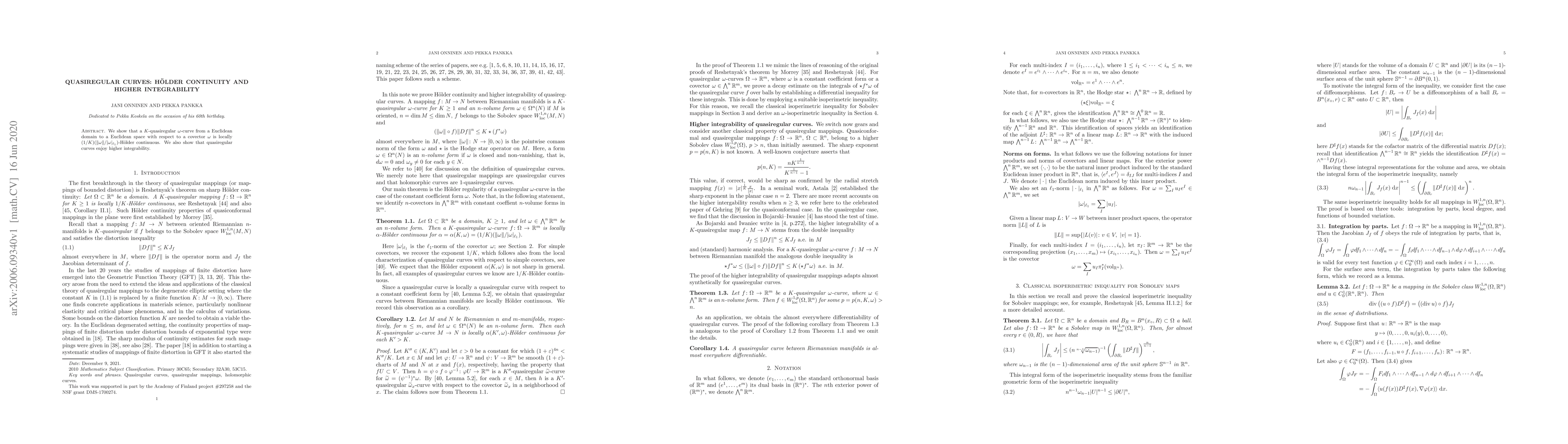 A quasiregular curve is shown to be locally H"older continuous with a specific exponent, and enjoys higher integrability in Euclidean spaces.