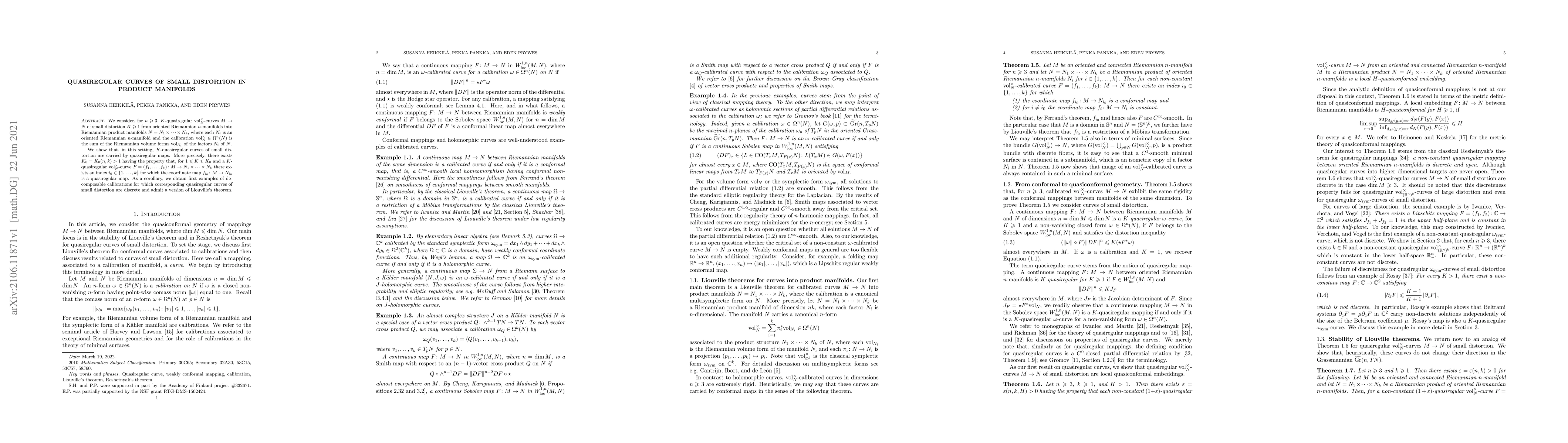 We consider, for $n\ge 3$, $K$-quasiregular $\operatorname{vol}_N^\times$-curves $M\to N$ of small distortion $K\ge 1$ from oriented Riemannian $n$-manifolds into Riemannian product manifolds $N=N_1\times \cdots \times N_k$, where each $N_i$ is an oriented Riemannian $n$-manifold and the calibration $\operatorname{vol}_N^\times\in \Omega^n(N)$ is the sum of the Riemannian volume forms $\operatorname{vol}_{N_i}$ of the factors $N_i$ of $N$. We show that, in this setting, $K$-quasiregular curves of small distortion are carried by quasiregular maps. More precisely, there exists $K_0=K_0(n,k)>1$ having the property that, for $1\le K\le K_0$ and a $K$-quasiregular $\operatorname{vol}_N^\times$-curve $F=(f_1,\ldots, f_k) \colon M \to N_1\times \cdots \times N_k$ there exists an index $i_0\in \{1,\ldots, k\}$ for which the coordinate map $f_{i_0}\colon M\to N_{i_0}$ is a quasiregular map. As a corollary, we obtain first examples of decomposable calibrations for which corresponding quasiregular curves of small distortion are discrete and admit a version of Liouville's theorem.