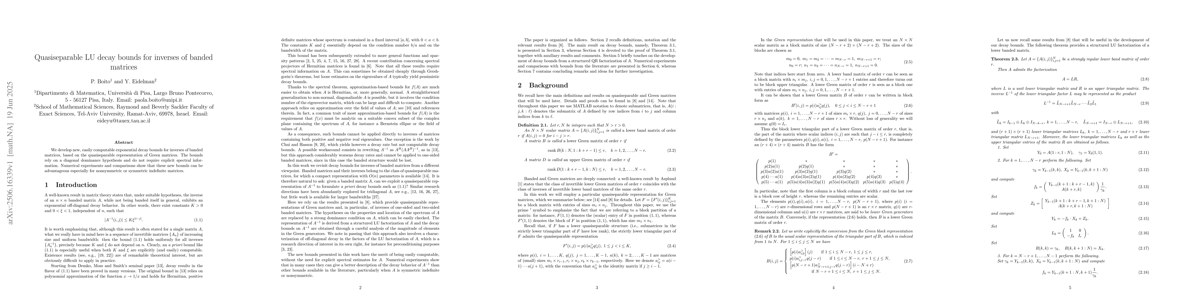 We develop new, easily computable exponential decay bounds for inverses of banded matrices, based on the quasiseparable representation of Green matrices. The bounds rely on a diagonal dominance hypothesis and do not require explicit spectral information. Numerical experiments and comparisons show that these new bounds can be advantageous especially for nonsymmetric or symmetric indefinite matrices.