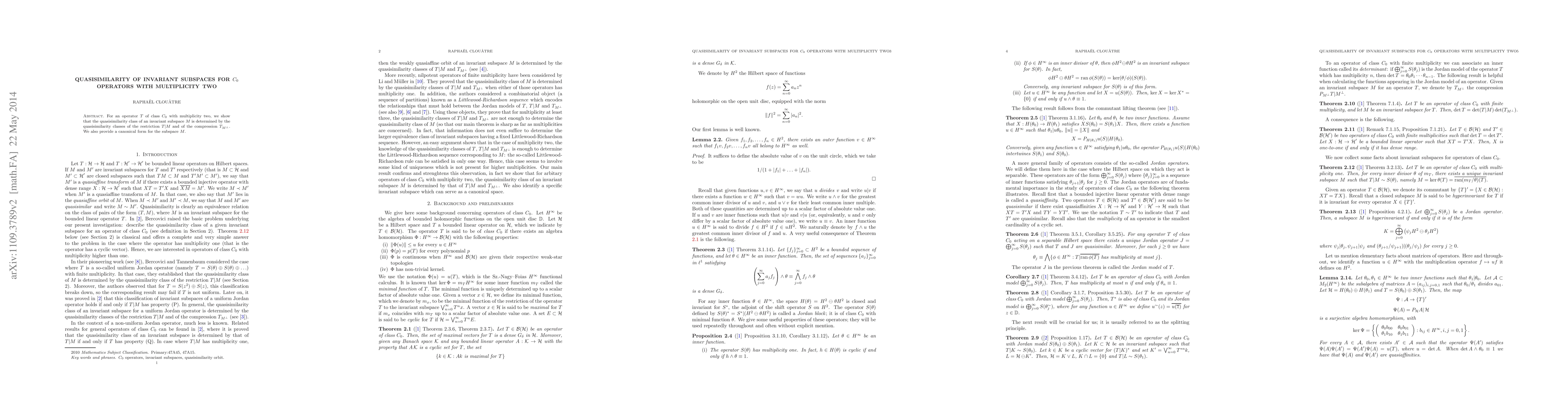 For an operator $T$ of class $C_0$ with multiplicity two, we show that the quasisimilarity class of an invariant subspace $M$ is determined by the quasisimilarity classes of the restriction $T|M$ and of the compression $T_{M^\perp}$. We also provide a canonical form for the subspace $M$.