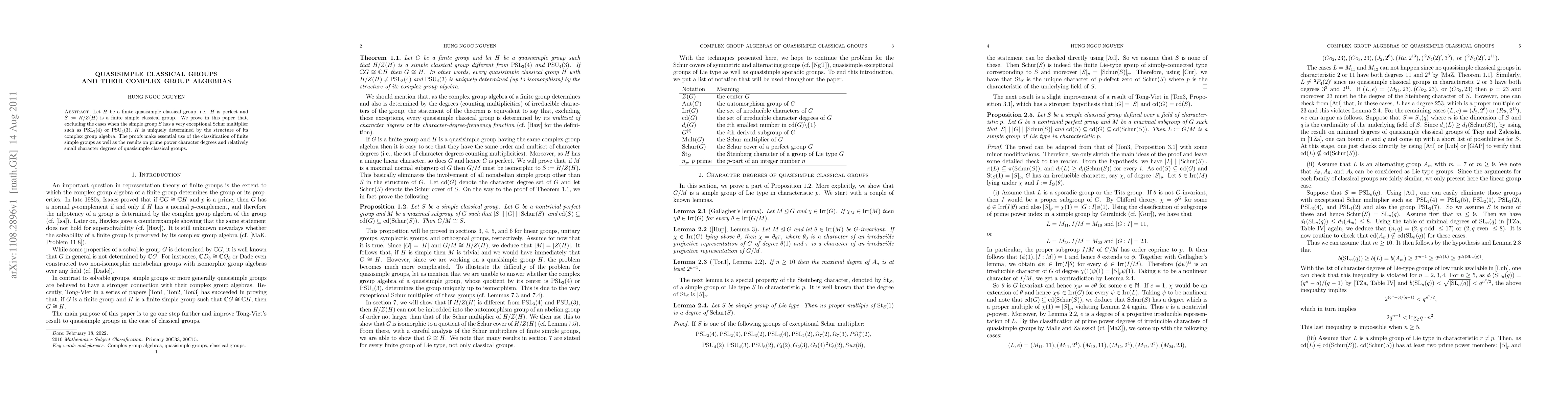 This paper demonstrates that finite quasisimple classical groups $H$, where $S = H/Z(H)$ is a simple classical group, are uniquely determined by their complex group algebra structure, except in cases involving specific exceptional Schur multipliers. The proof leverages the classification of finite simple groups and character degree analysis.