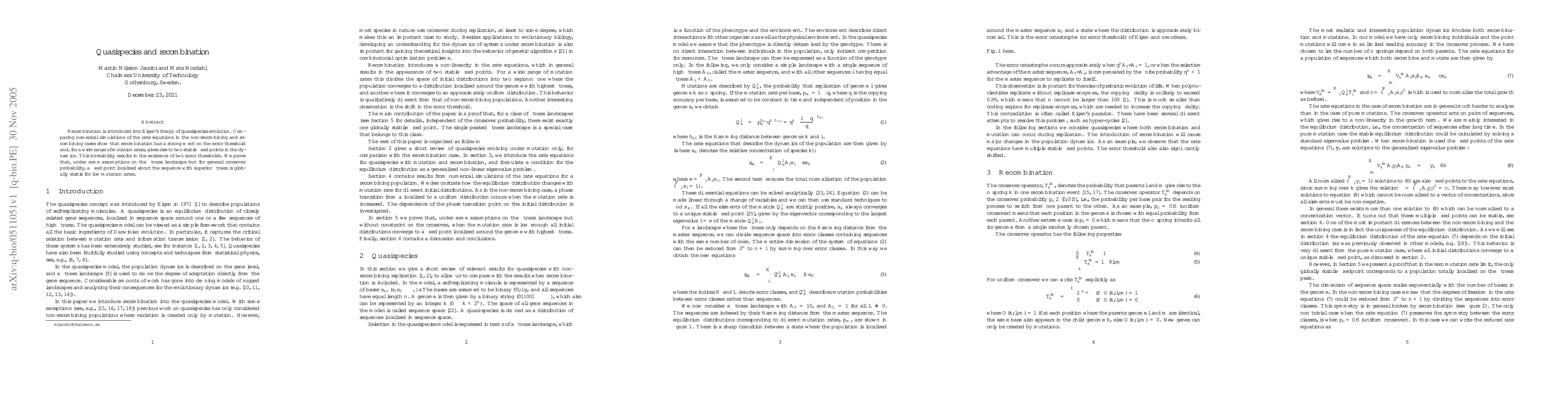 This paper introduces recombination into Eigen's quasispecies theory, demonstrating that it significantly alters the error threshold and leads to bi-stability with two distinct error thresholds. Under certain fitness landscape assumptions, a superior fitness sequence becomes globally stable at low mutation rates.