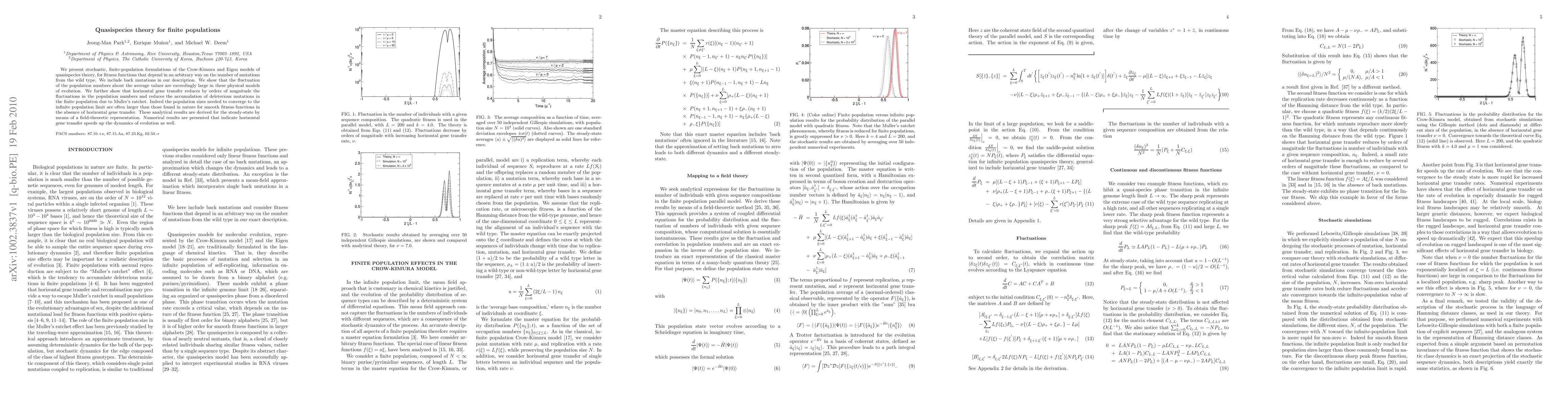 We present stochastic, finite-population formulations of the Crow-Kimura and Eigen models of quasispecies theory, for fitness functions that depend in an arbitrary way on the number of mutations from the wild type. We include back mutations in our description. We show that the fluctuation of the population numbers about the average values are exceedingly large in these physical models of evolution. We further show that horizontal gene transfer reduces by orders of magnitude the fluctuations in the population numbers and reduces the accumulation of deleterious mutations in the finite population due to Muller's ratchet. Indeed the population sizes needed to converge to the infinite population limit are often larger than those found in nature for smooth fitness functions in the absence of horizontal gene transfer. These analytical results are derived for the steady-state by means of a field-theoretic representation. Numerical results are presented that indicate horizontal gene transfer speeds up the dynamics of evolution as well.