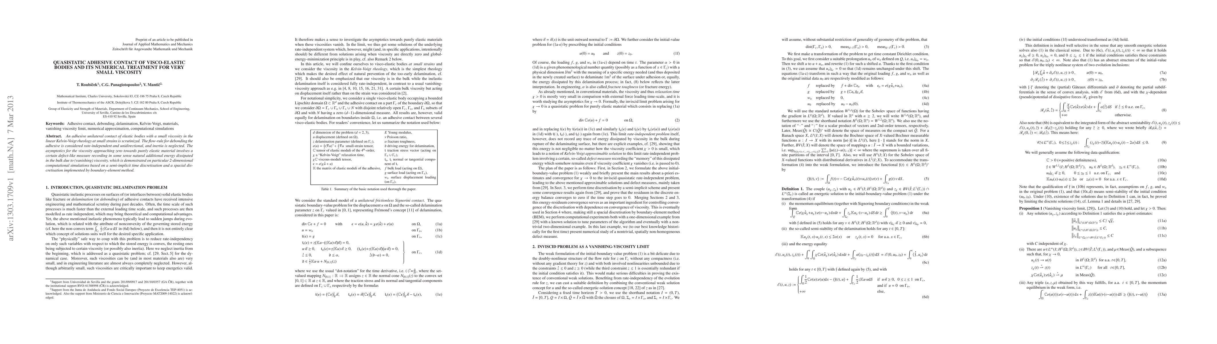 An adhesive unilateral contact of elastic bodies with a small viscosity in the linear Kelvin-Voigt rheology at small strains is scrutinized. The flow-rule for debonding the adhesive is considered rate-independent and unidirectional, and inertia is neglected. The asymptotics for the viscosity approaching zero towards purely elastic material involves a certain defect-like measure recording in some sense natural additional energy dissipated in the bulk due to (vanishing) viscosity, which is demonstrated on particular 2-dimensional computational simulations based on a semi-implicit time discretisation and a spacial discretisation implemented by boundary-element method.