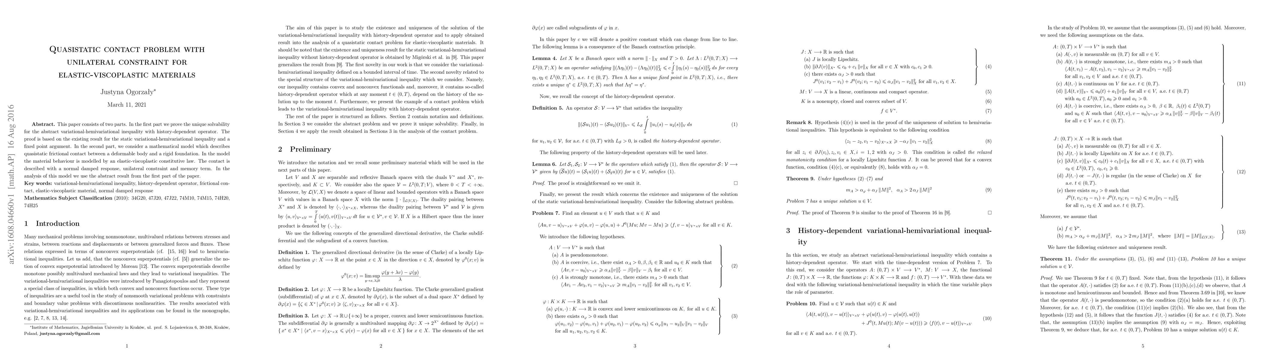 This paper proves the unique solvability of a variational-hemivariational inequality for elastic-viscoplastic materials and applies this result to model quasistatic contact with unilateral constraint and memory effects in deformable bodies.