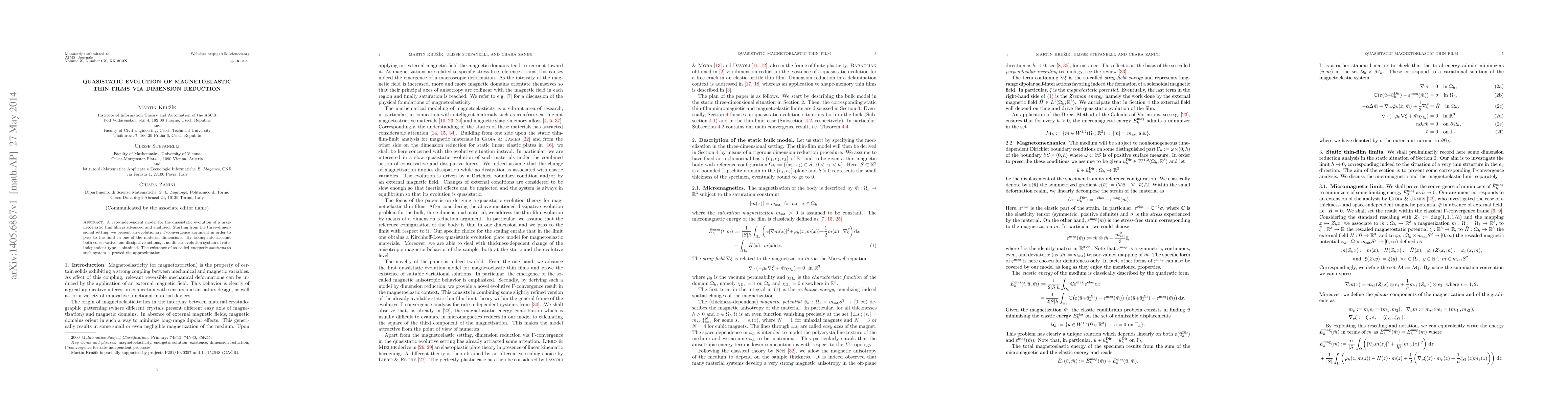A rate-independent model for the quasistatic evolution of a magnetoelastic thin film is advanced and analyzed. Starting from the three-dimensional setting, we present an evolutionary $\Gamma$-convergence argument in order to pass to the limit in one of the material dimensions. By taking into account both conservative and dissipative actions, a nonlinear evolution system of rate-independent type is obtained. The existence of so-called {\it energetic solutions} to such system is proved via approximation.
