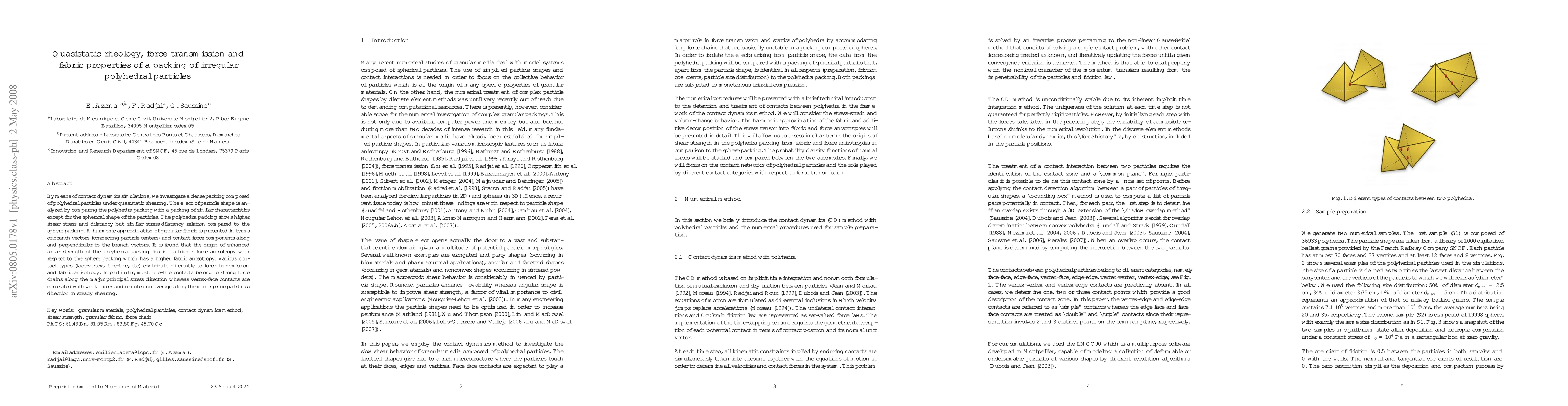 Research explores how irregular polyhedral particles behave under shearing forces, finding they exhibit higher shear stress and dilatancy compared to spherical particles due to anisotropy in force transmission.