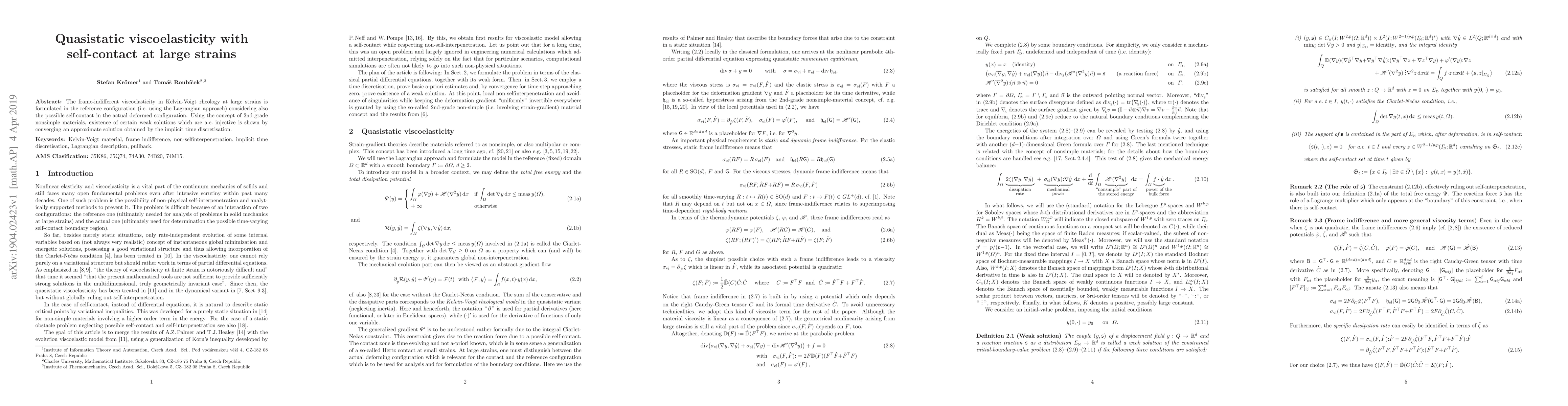 Researchers developed a new framework for modeling viscoelastic behavior at large strains, considering self-contact in both reference and actual configurations. They showed the existence of certain weak solutions using an approximate solution obtained by implicit time discretization.