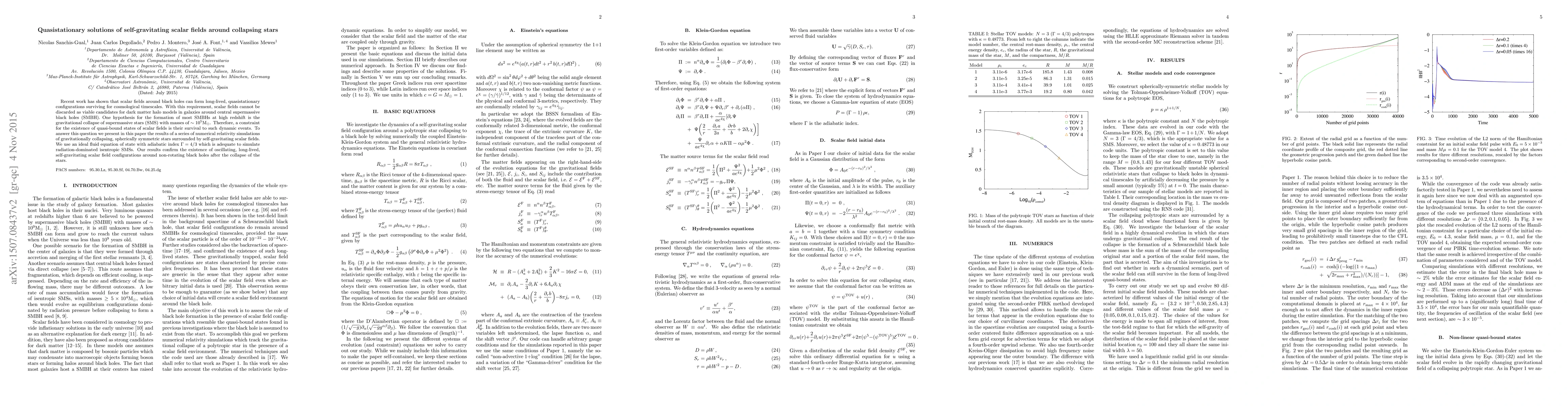 Recent work has shown that scalar fields around black holes can form long-lived, quasistationary configurations surviving for cosmological timescales. With this requirement, scalar fields cannot be discarded as viable candidates for dark matter halo models in galaxies around central supermassive black holes (SMBH). One hypothesis for the formation of most SMBHs at high redshift is the gravitational collapse of supermassive stars (SMS) with masses of $\sim10^5 \rm {M_{\odot}}$. Therefore, a constraint for the existence of quasi-bound states of scalar fields is their survival to such dynamic events. To answer this question we present in this paper the results of a series of numerical relativity simulations of gravitationally collapsing, spherically symmetric stars surrounded by self-gravitating scalar fields. We use an ideal fluid equation of state with adiabatic index $\Gamma=4/3$ which is adequate to simulate radiation-dominated isentropic SMSs. Our results confirm the existence of oscillating, long-lived, self-gravitating scalar field configurations around non-rotating black holes after the collapse of the stars.