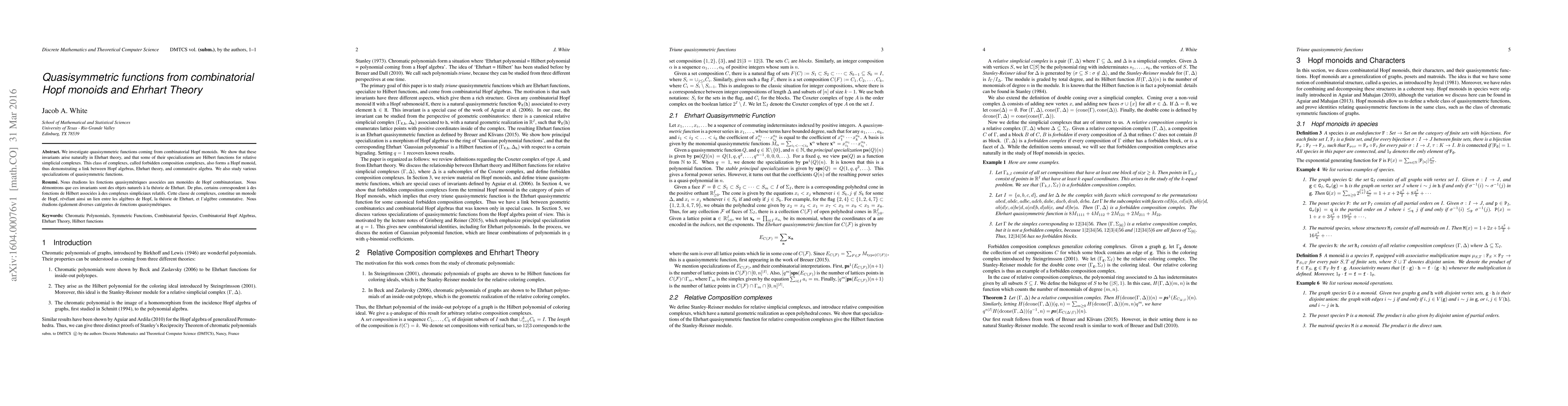 We investigate quasisymmetric functions coming from combinatorial Hopf monoids. We show that these invariants arise naturally in Ehrhart theory, and that some of their specializations are Hilbert functions for relative simplicial complexes. This class of complexes, called forbidden composition complexes, also forms a Hopf monoid, thus demonstrating a link between Hopf algebras, Ehrhart theory, and commutative algebra. We also study various specializations of quasisymmetric functions.