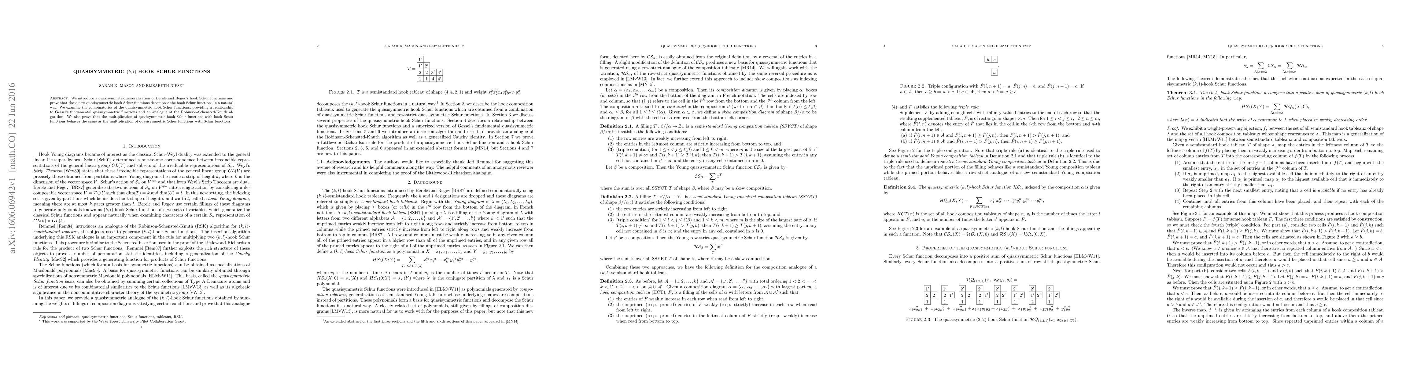 This paper presents a quasisymmetric extension of Berele and Regev's hook Schur functions, showing they decompose original hook Schur functions naturally. The study reveals connections to Gessel's quasisymmetric functions and an analogue of the Robinson-Schensted-Knuth algorithm, and proves similar multiplication properties as quasisymmetric Schur functions with Schur functions.