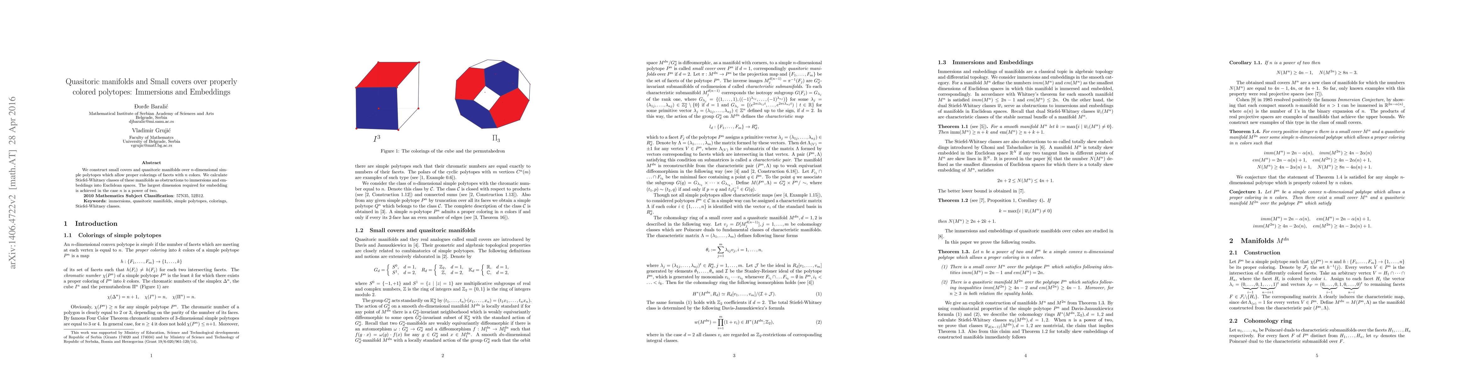 Summary: This paper constructs small covers and quasitoric manifolds over properly colored $n$-dimensional polytopes, calculating their Stiefel-Whitney classes to determine obstructions for immersions and embeddings into Euclidean spaces, with the largest embedding dimension occurring when $n$ is a power of two.