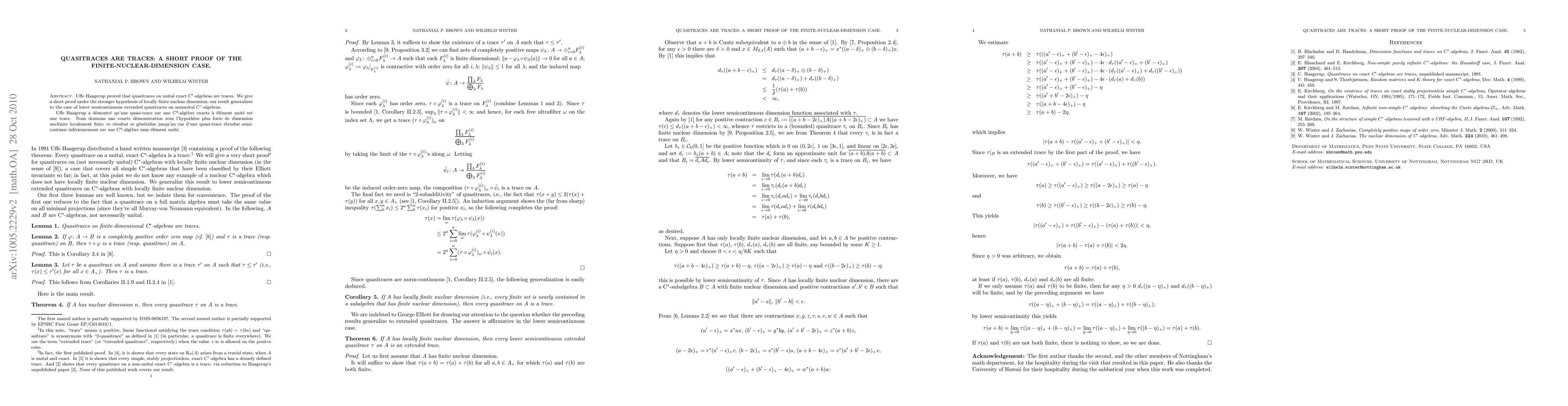 Uffe Haagerup proved that quasitraces on unital exact C* -algebras are traces. We give a short proof under the stronger hypothesis of finite nuclear dimension.