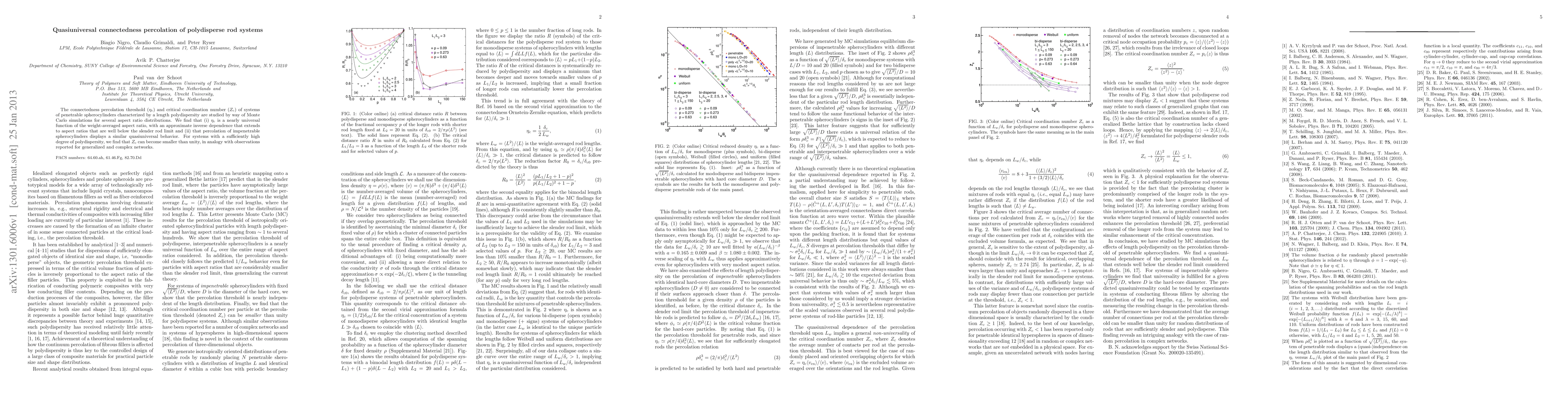 The connectedness percolation threshold (eta_c) and critical coordination number (Z_c) of systems of penetrable spherocylinders characterized by a length polydispersity are studied by way of Monte Carlo simulations for several aspect ratio distributions. We find that (i) \eta_c is a nearly universal function of the weight-averaged aspect ratio, with an approximate inverse dependence that extends to aspect ratios that are well below the slender rod limit and (ii) that percolation of impenetrable spherocylinders displays a similar quasiuniversal behavior. For systems with a sufficiently high degree of polydispersity, we find that Z_c can become smaller than unity, in analogy with observations reported for generalized and complex networks.