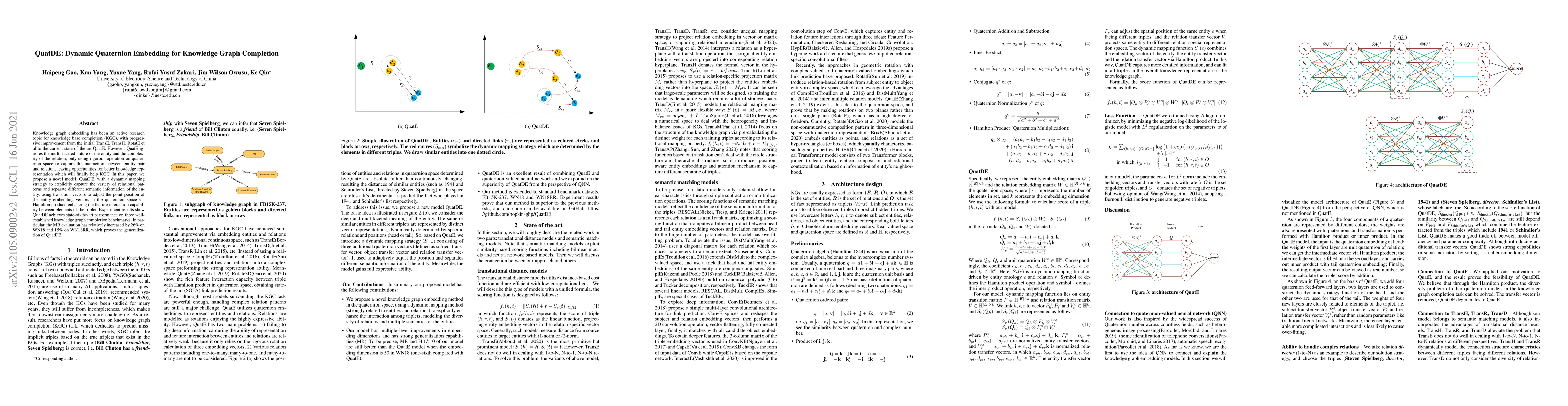 The paper proposes QuatDE, a dynamic quaternion embedding model for knowledge graph completion, which uses transition vectors to adjust entity embeddings and captures multi-faceted relational patterns, achieving state-of-the-art performance on benchmarks with notable improvements in MR scores.