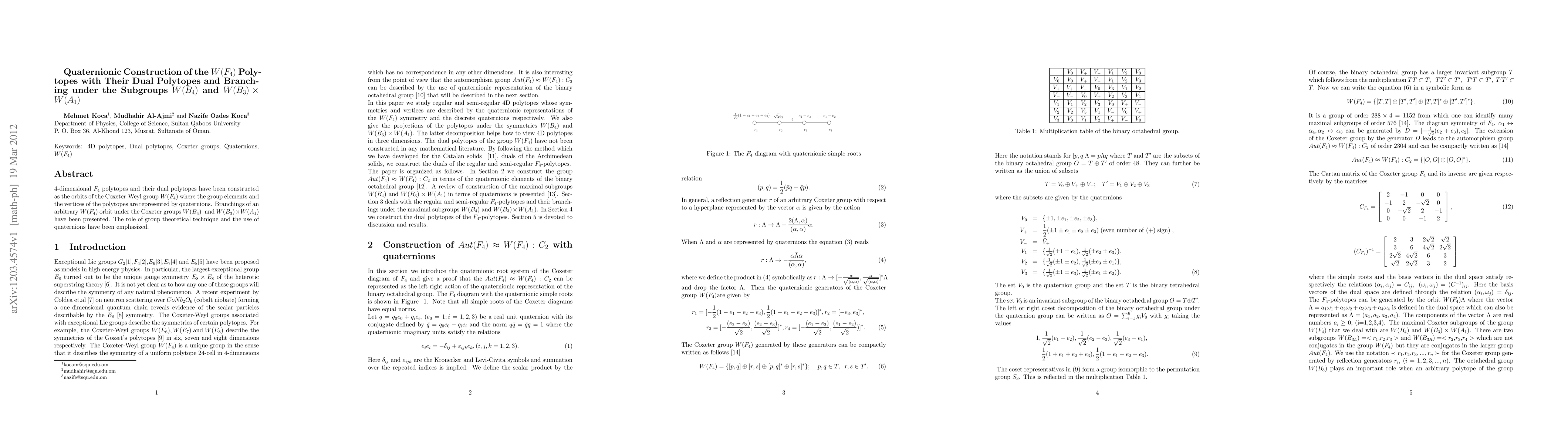 This paper constructs 4-dimensional $F_{4}$ polytopes and their duals using quaternion representations of the Coxeter-Weyl group $W(F_{4})$. It also explores the branching of $W(F_{4})$ orbits under subgroups $W(B_{4})$ and $W(B_{3}) \times W(A_{1})$, highlighting the significance of group theory and quaternions in the analysis.