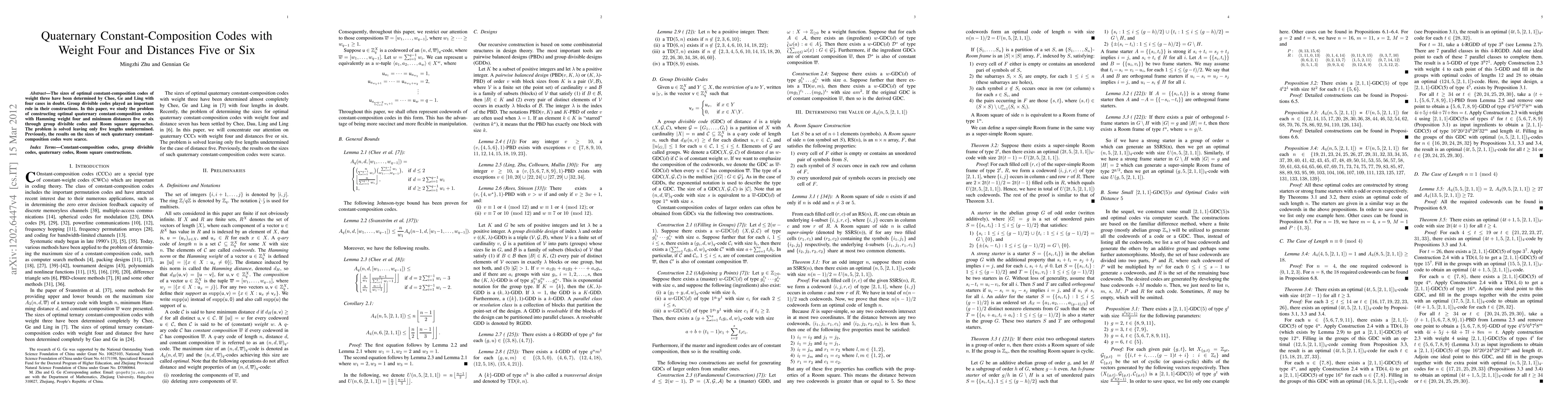 This paper resolves the construction of optimal quaternary constant-composition codes with Hamming weight four and minimum distances of five or six, significantly reducing the number of undetermined lengths from four to five. It employs group divisible codes and Room square methodologies to achieve this.