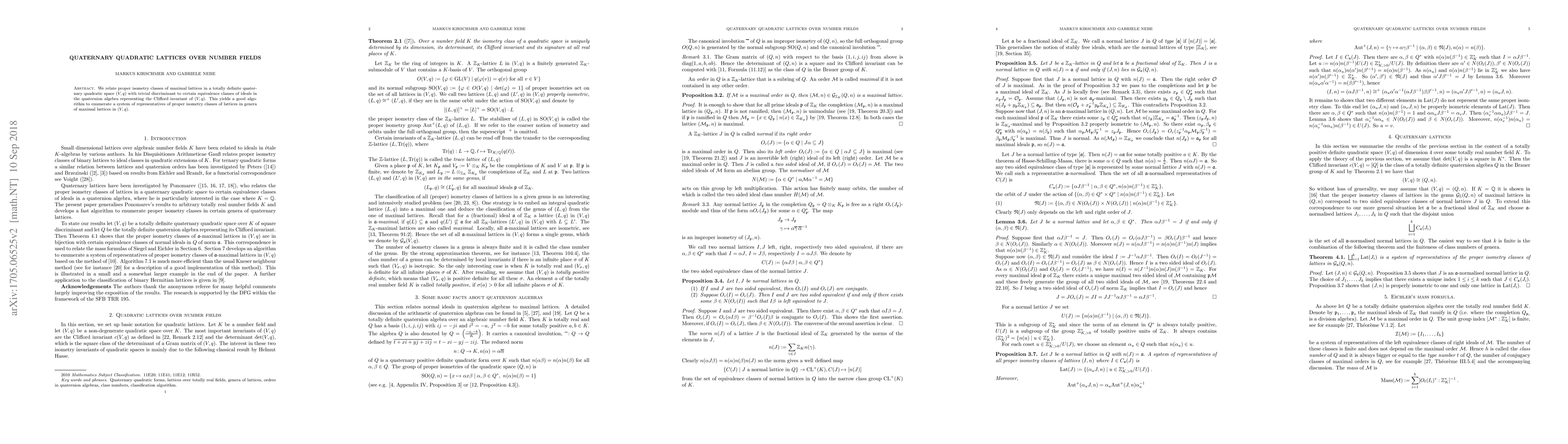 We relate proper isometry classes of maximal lattices in a totally definite quaternary quadratic space (V,q) with trivial discriminant to certain equivalence classes of ideals in the quaternion algebra representing the Clifford invariant of (V,q). This yields a good algorithm to enumerate a system of representatives of proper isometry classes of lattices in genera of maximal lattices in (V,q).