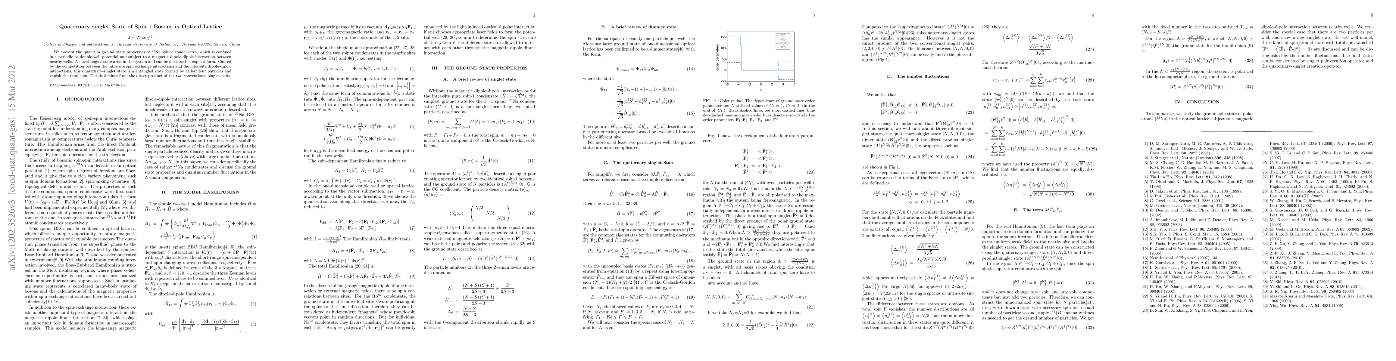 We present the quantum ground state properties of $^{23}$Na spinor condensates, which is confined in a periodic or double-well potential and subject to a magnetic dipole-dipole interaction between nearby wells. A novel singlet state arise in the system and can be discussed in explicit form. Caused by the competition between the intra-site spin exchange interactions and the inter-site dipole-dipole interactions, this quaternary-singlet\ state is a entangled state formed by at lest four particles and vanish the total spin. This is distinct from the direct product of the two conventional singlet pairs.