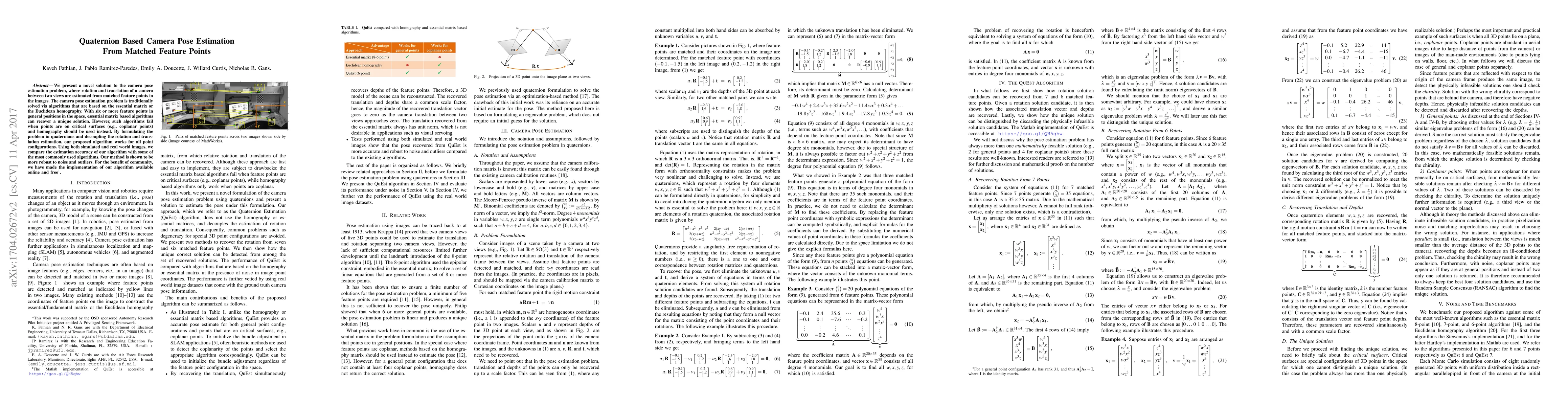 A new algorithm using quaternions improves camera pose estimation accuracy by decoupling rotation and translation from matched feature points, outperforming traditional methods in simulations and real-world images.