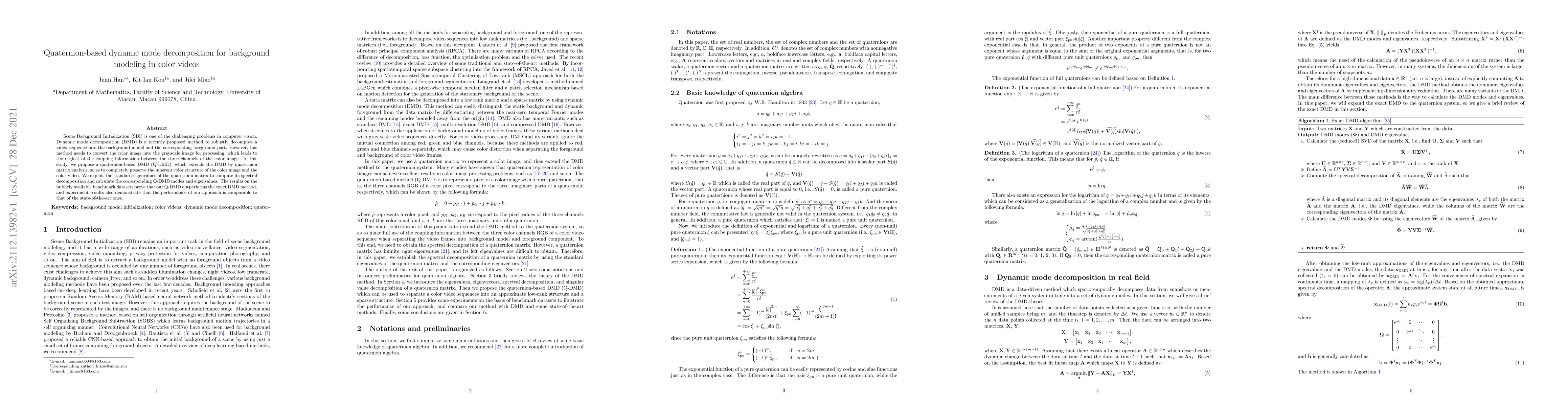 This paper proposes a quaternion-based dynamic mode decomposition (Q-DMD) method to improve background modeling in color videos by preserving color information. The Q-DMD outperforms traditional DMD and is comparable to state-of-the-art methods, as demonstrated on benchmark datasets.
