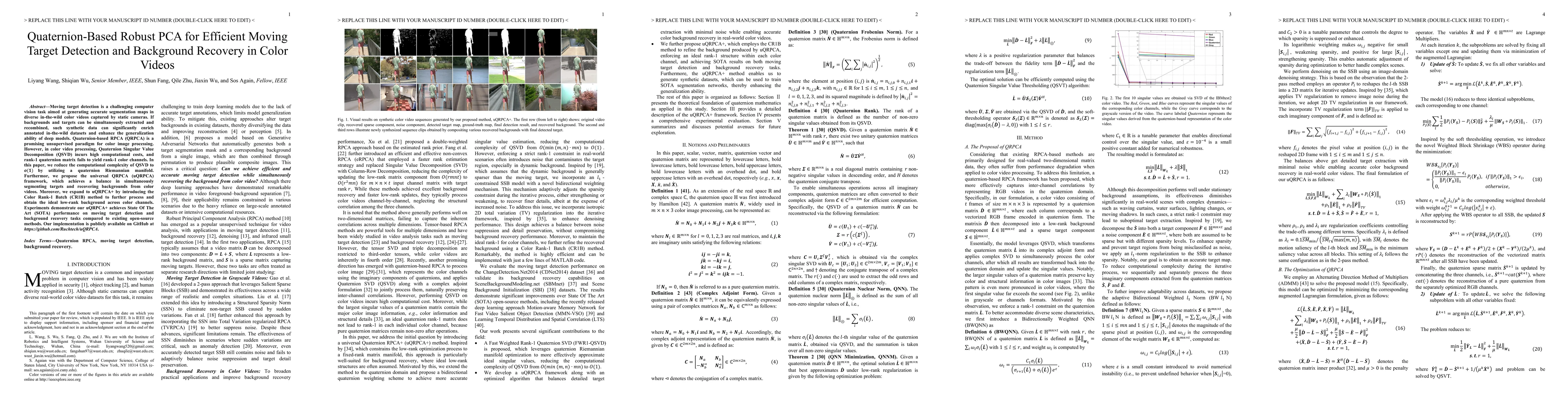 Moving target detection is a challenging computer vision task aimed at generating accurate segmentation maps in diverse in-the-wild color videos captured by static cameras. If backgrounds and targets can be simultaneously extracted and recombined, such synthetic data can significantly enrich annotated in-the-wild datasets and enhance the generalization ability of deep models. Quaternion-based RPCA (QRPCA) is a promising unsupervised paradigm for color image processing. However, in color video processing, Quaternion Singular Value Decomposition (QSVD) incurs high computational costs, and rank-1 quaternion matrix fails to yield rank-1 color channels. In this paper, we reduce the computational complexity of QSVD to o(1) by utilizing a quaternion Riemannian manifold. Furthermor, we propose the universal QRPCA (uQRPCA) framework, which achieves a balance in simultaneously segmenting targets and recovering backgrounds from color videos. Moreover, we expand to uQRPCA+ by introducing the Color Rank-1 Batch (CR1B) method to further process and obtain the ideal low-rank background across color channels. Experiments demonstrate our uQRPCA+ achieves State Of The Art (SOTA) performance on moving target detection and background recovery tasks compared to existing open-source methods. Our implementation is publicly available on GitHub at https://github.com/Ruchtech/uQRPCA