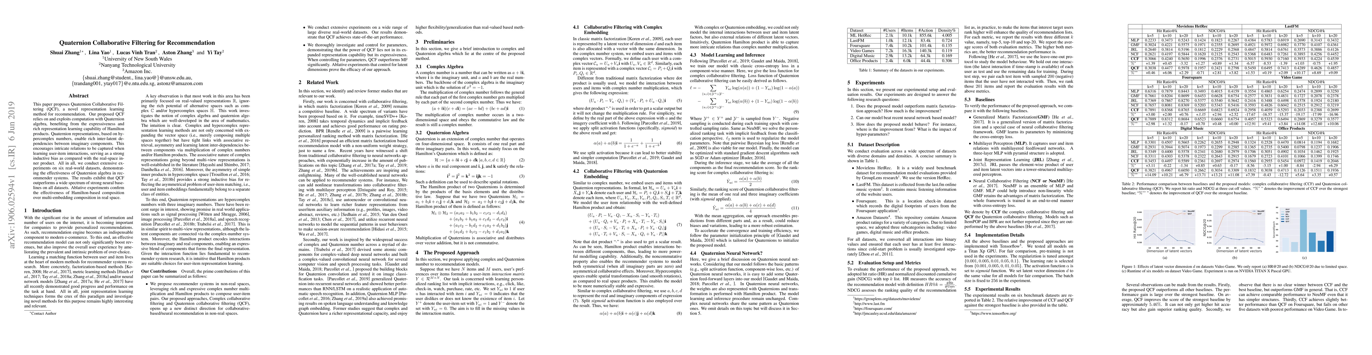 Quaternion Collaborative Filtering (QCF) is a novel recommendation method that leverages Hamilton products to learn rich user-item interactions, outperforming strong neural baselines on six real-world datasets.