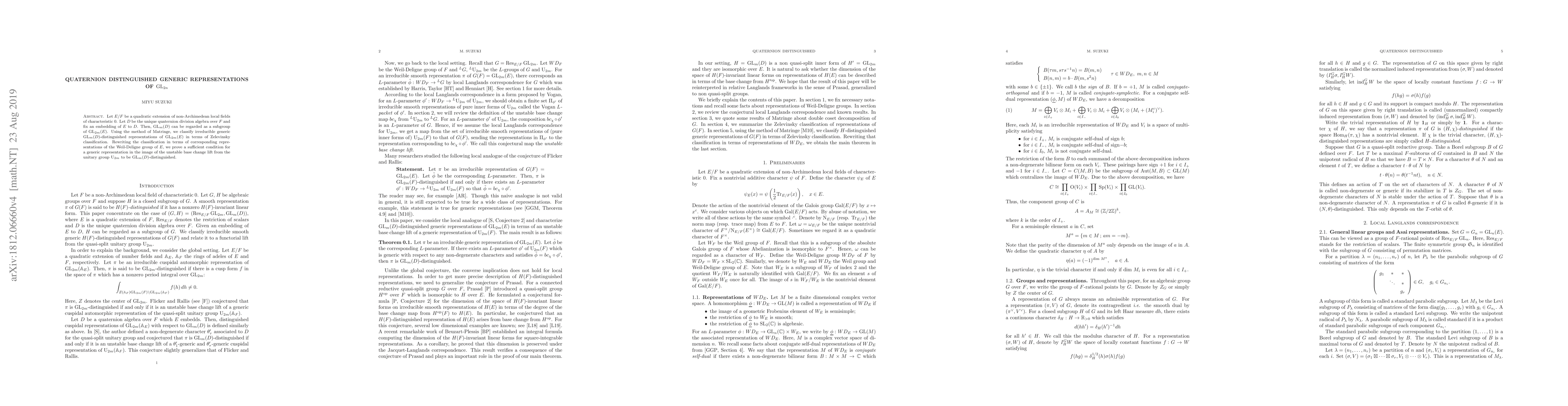 Let $E/F$ be a quadratic extension of non-Archimedean local fields of characteristic 0. Let $D$ be the unique quaternion division algebra over $F$ and fix an embedding of $E$ to $D$. Then, $\mathrm{GL}_m(D)$ can be regarded as a subgroup of $\mathrm{GL}_{2m}(E)$. Using the method of Matringe, we classify irreducible generic $\mathrm{GL}_m(D)$-distinguished representations of $\mathrm{GL}_{2m}(E)$ in terms of Zelevinsky classification. Rewriting the classification in terms of corresponding representations of the Weil-Deligne group of $E$, we prove a sufficient condition for a generic representation in the image of the unstable base change lift from the unitary group $\mathrm{U}_{2m}$ to be $\mathrm{GL}_m(D)$-distinguished.