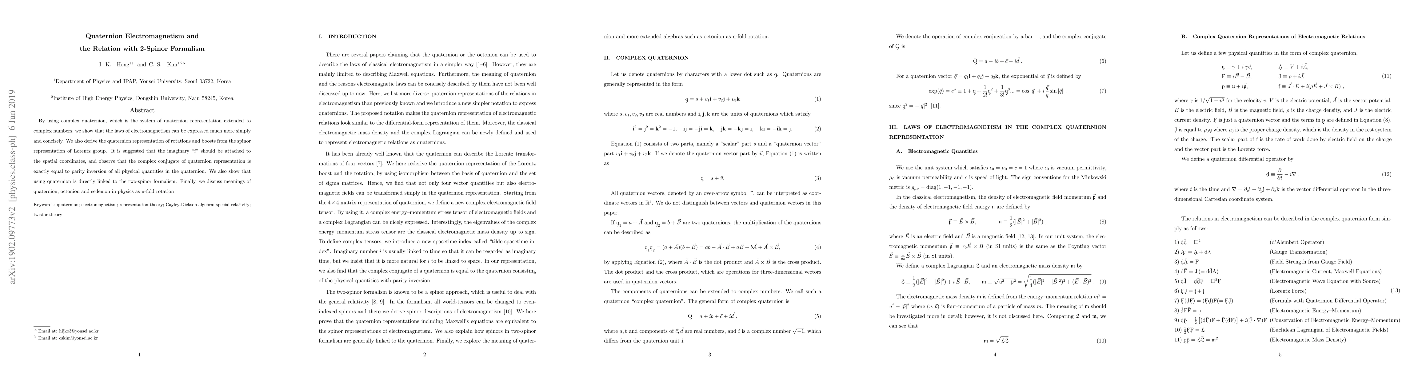 This paper demonstrates that electromagnetism can be elegantly expressed using complex quaternions, linking them to the two-spinor formalism. It also explores the implications of quaternion rotations and boosts, suggesting a connection between the complex conjugate of quaternions and parity inversion.