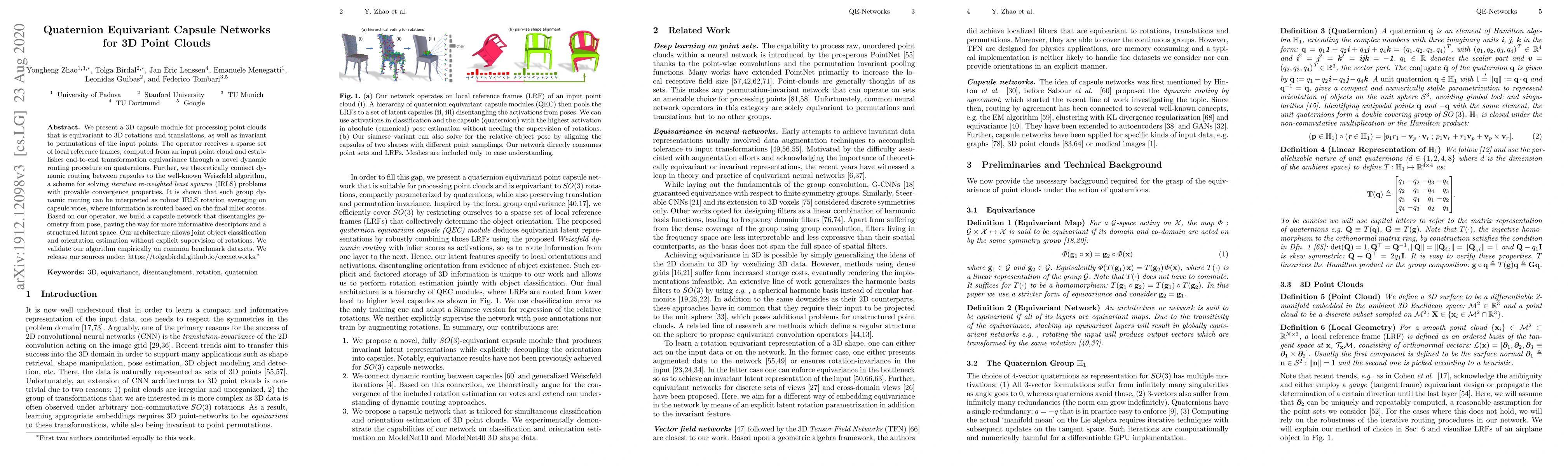 We present a 3D capsule module for processing point clouds that is equivariant to 3D rotations and translations, as well as invariant to permutations of the input points. The operator receives a sparse set of local reference frames, computed from an input point cloud and establishes end-to-end transformation equivariance through a novel dynamic routing procedure on quaternions. Further, we theoretically connect dynamic routing between capsules to the well-known Weiszfeld algorithm, a scheme for solving \emph{iterative re-weighted least squares} (IRLS) problems with provable convergence properties. It is shown that such group dynamic routing can be interpreted as robust IRLS rotation averaging on capsule votes, where information is routed based on the final inlier scores. Based on our operator, we build a capsule network that disentangles geometry from pose, paving the way for more informative descriptors and a structured latent space. Our architecture allows joint object classification and orientation estimation without explicit supervision of rotations. We validate our algorithm empirically on common benchmark datasets.